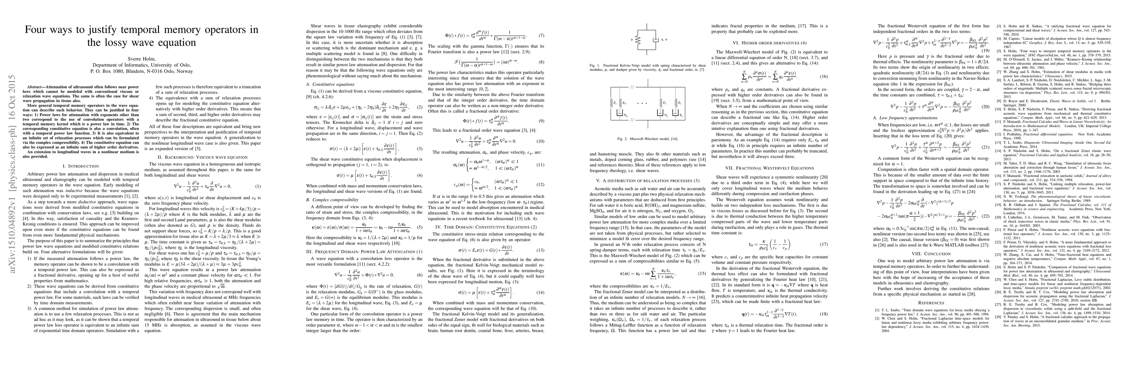 Attenuation of ultrasound often follows near power laws which cannot be modeled with conventional viscous or relaxation wave equations. The same is often the case for shear wave propagation in tissue also. More general temporal memory operators in the wave equation can describe such behavior. They can be justified in four ways: 1) Power laws for attenuation with exponents other than two correspond to the use of convolution operators with a temporal memory kernel which is a power law in time. 2) The corresponding constitutive equation is also a convolution, often with a temporal power law function. 3) It is also equivalent to an infinite set of relaxation processes which can be formulated via the complex compressibility. 4) The constitutive equation can also be expressed as an infinite sum of higher order derivatives. An extension to longitudinal waves in a nonlinear medium is also provided.