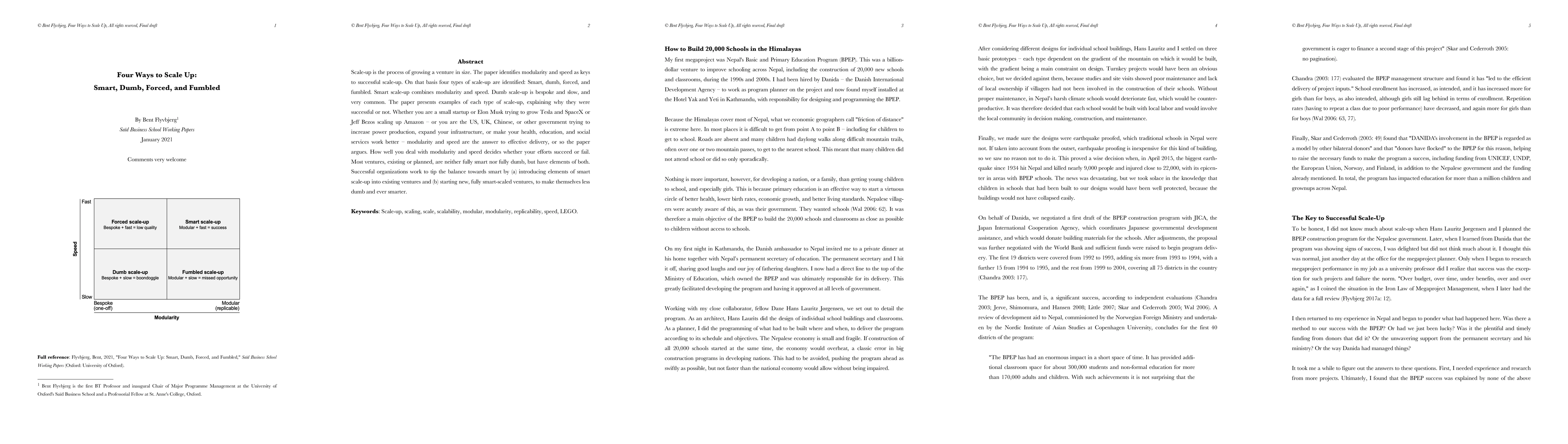 This paper categorizes scale-up into four types: Smart, Dumb, Forced, and Fumbled, emphasizing modularity and speed as keys to successful growth. It argues that smart scale-up, which combines both, is most effective, while dumb scale-up, which lacks these elements, often fails.