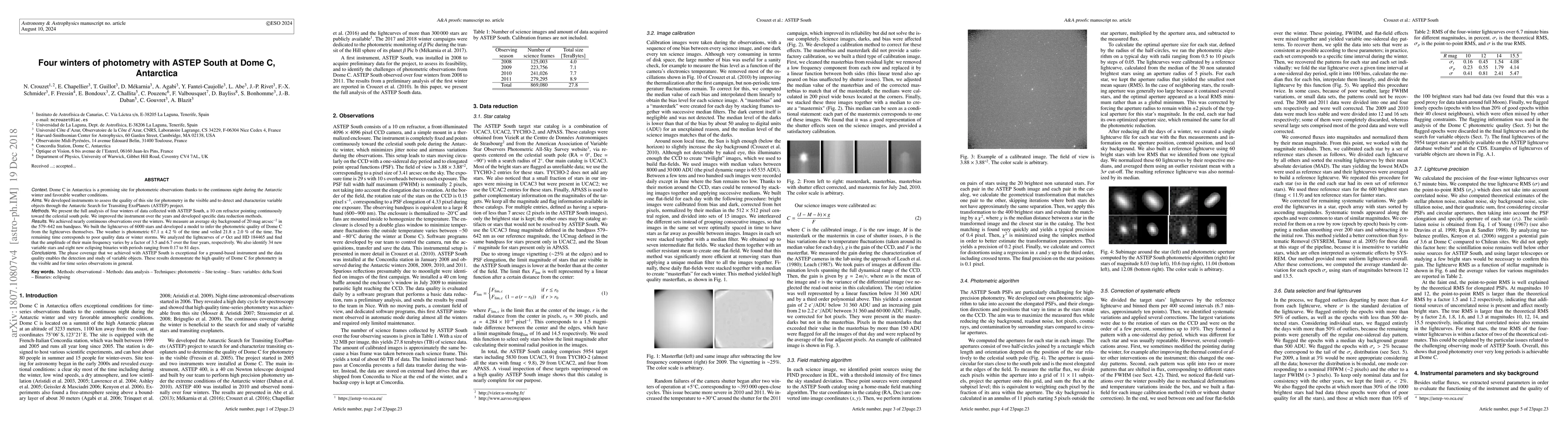 This paper reports four years of photometric observations from Dome C, Antarctica, using the ASTEP South instrument, revealing high-quality data with an average sky background of 20 mag arcsec$^{-2}$. The study identifies 34 new variable stars and eight new eclipsing binaries, demonstrating Dome C's suitability for ground-based photometric and time series observations.