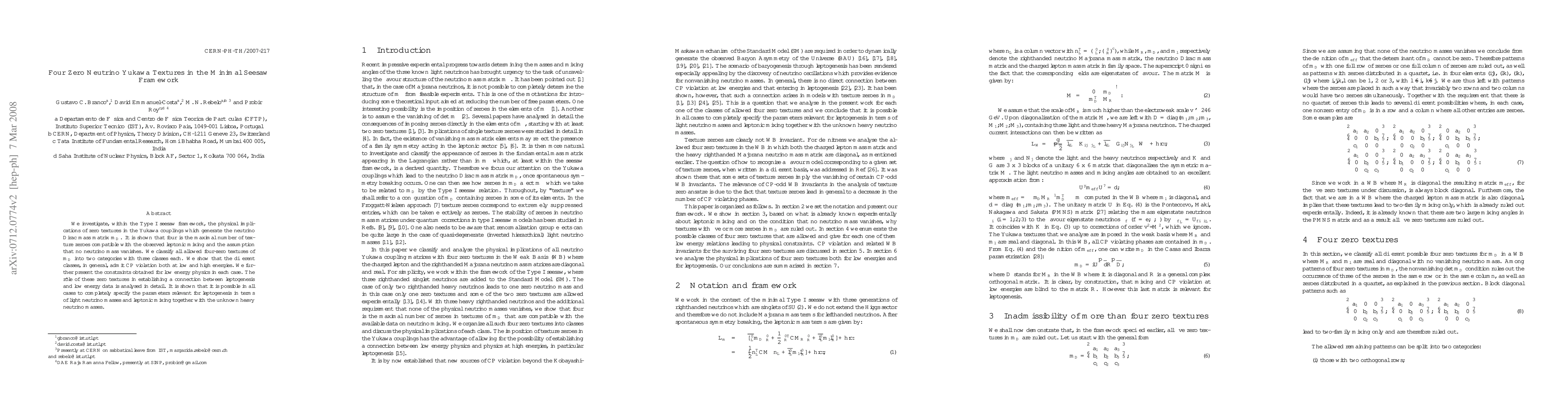 We investigate, within the Type I seesaw framework, the physical implications of zero textures in the Yukawa couplings which generate the neutrino Dirac mass matrix $m_D$. It is shown that four is the maximal number of texture zeroes compatible with the observed leptonic mixing and the assumption that no neutrino mass vanishes. We classify all allowed four-zero textures of $m_D$ into two categories with three classes each. We show that the different classes, in general, admit CP violation both at low and high energies. We further present the constraints obtained for low energy physics in each case. The r\^ ole of these zero textures in establishing a connection between leptogenesis and low energy data is analysed in detail. It is shown that it is possible in all cases to completely specify the parameters relevant for leptogenesis in terms of light neutrino masses and leptonic mixing together with the unknown heavy neutrino masses.