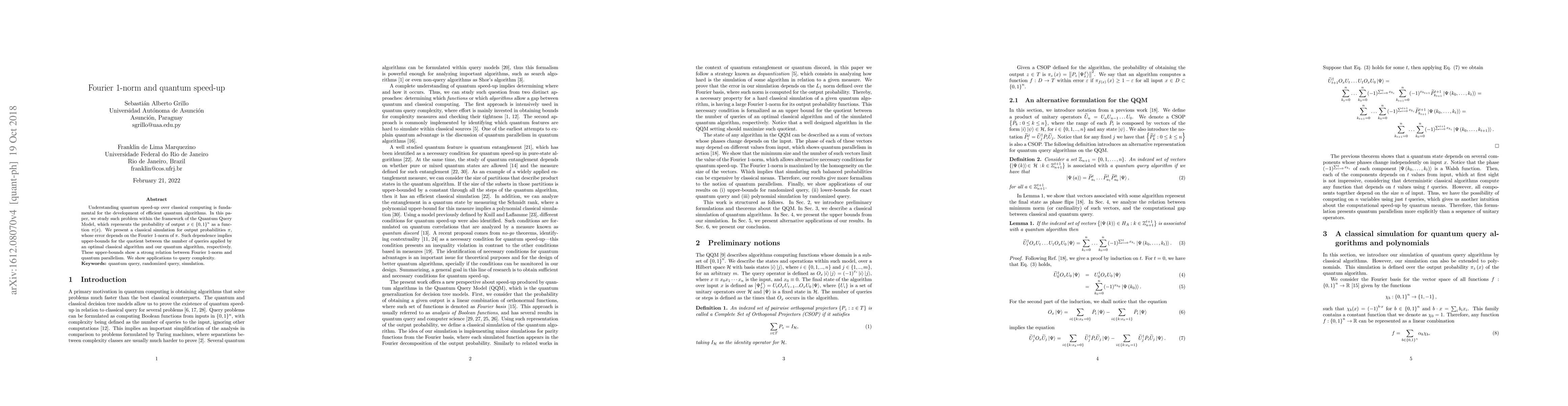 This paper studies quantum speed-up in the Quantum Query Model, showing a connection between Fourier 1-norm and quantum parallelism, with implications for query complexity.
