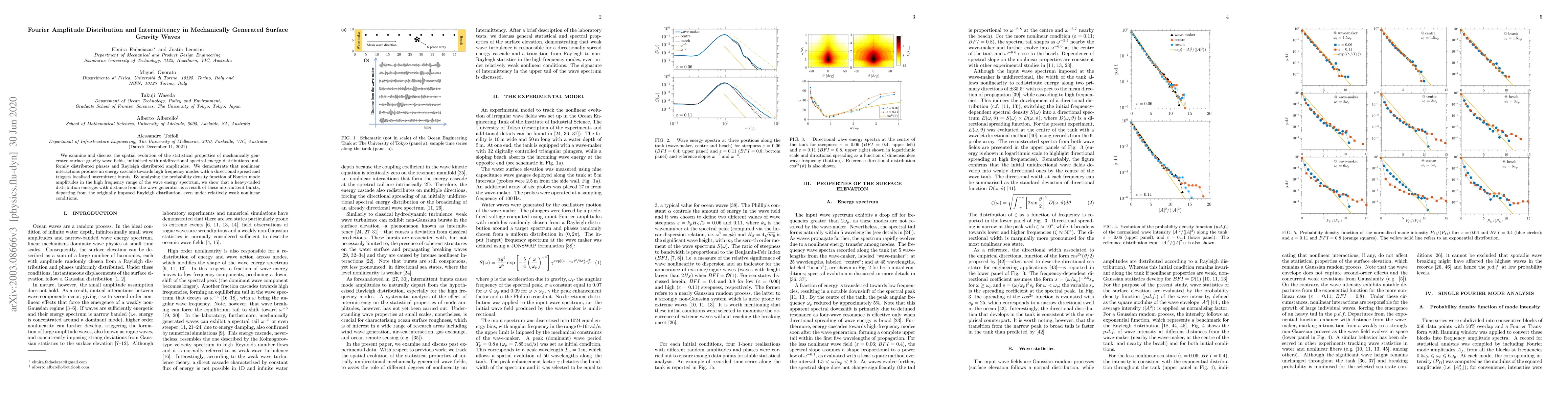 This research investigates mechanically created surface gravity waves, showing that nonlinear interactions cause energy to cascade to higher frequencies, spreading directionally and causing intermittent bursts. Analyzing Fourier mode amplitudes reveals a heavy-tailed distribution emerging from the initial Rayleigh distribution due to these bursts, even under mild nonlinear conditions.