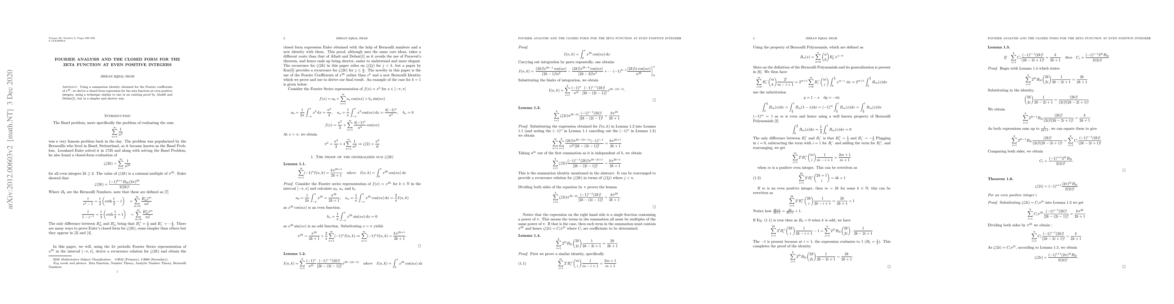 Summary: This paper derives a closed form expression for the zeta function at even positive integers using a Fourier analysis technique, simplifying and shortening a method previously used by Aladdi and Defant. The approach leverages a new summation identity for the Fourier coefficients of $x^{2k}$.