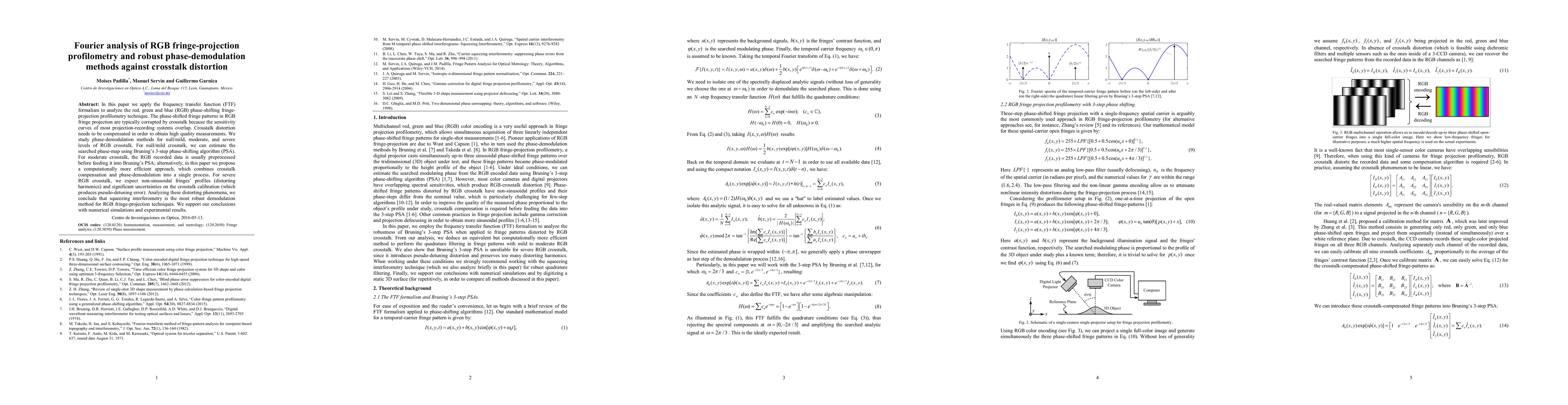 This paper uses Fourier analysis to evaluate RGB fringe-projection profilometry, focusing on phase-demodulation methods for varying levels of crosstalk distortion. It proposes efficient techniques to compensate for crosstalk and concludes that squeezing interferometry is the most robust method for severe crosstalk scenarios, supported by simulations and experiments.
