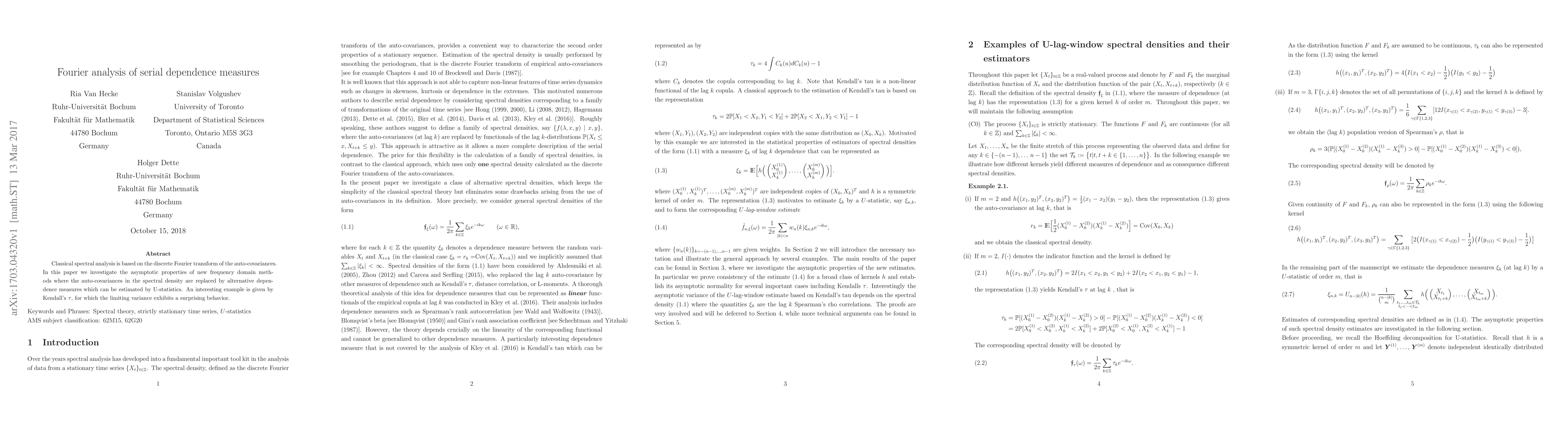 Classical spectral analysis is based on the discrete Fourier transform of the auto-covariances. In this paper we investigate the asymptotic properties of new frequency domain methods where the auto-covariances in the spectral density are replaced by alternative dependence measures which can be estimated by U-statistics. An interesting example is given by Kendall{'}s $\tau$ , for which the limiting variance exhibits a surprising behavior.