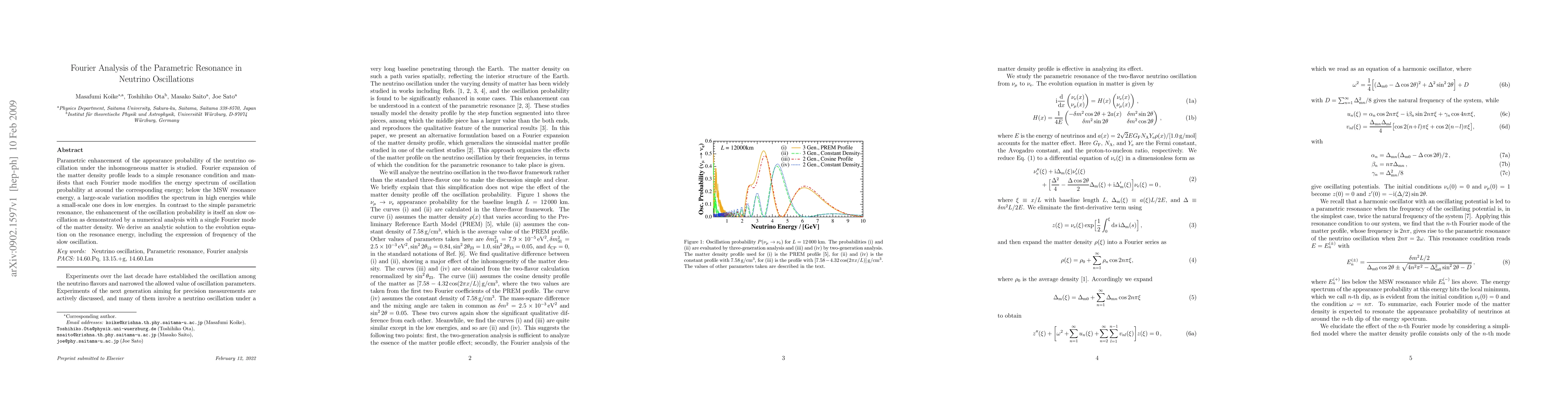 Researchers studied how parametric resonance in neutrino oscillations affects energy spectra, finding that each Fourier mode modifies the spectrum around its corresponding energy; a slow oscillation is also observed in the enhancement of oscillation probability.