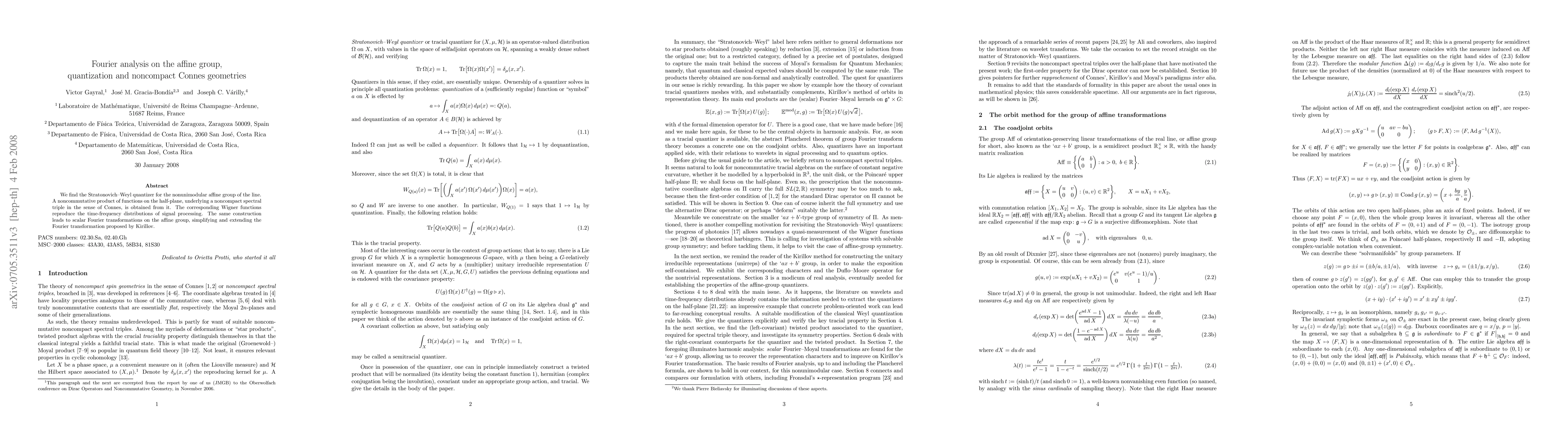 We find the Stratonovich-Weyl quantizer for the nonunimodular affine group of the line. A noncommutative product of functions on the half-plane, underlying a noncompact spectral triple in the sense of Connes, is obtained from it. The corresponding Wigner functions reproduce the time-frequency distributions of signal processing. The same construction leads to scalar Fourier transformations on the affine group, simplifying and extending the Fourier transformation proposed by Kirillov.