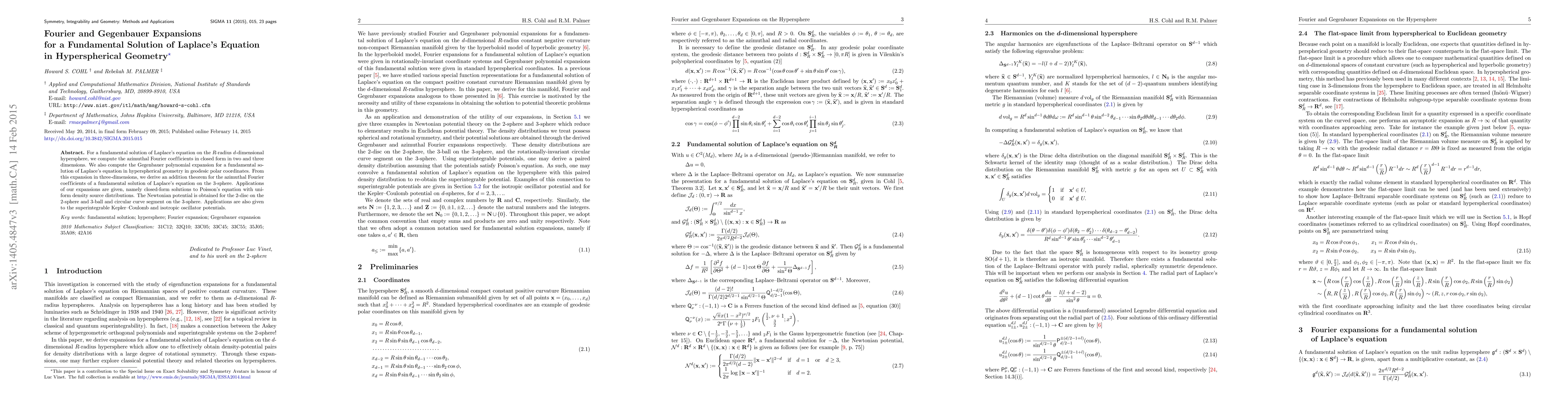 For a fundamental solution of Laplace's equation on the $R$-radius $d$-dimensional hypersphere, we compute the azimuthal Fourier coefficients in closed form in two and three dimensions. We also compute the Gegenbauer polynomial expansion for a fundamental solution of Laplace's equation in hyperspherical geometry in geodesic polar coordinates. From this expansion in three-dimensions, we derive an addition theorem for the azimuthal Fourier coefficients of a fundamental solution of Laplace's equation on the 3-sphere. Applications of our expansions are given, namely closed-form solutions to Poisson's equation with uniform density source distributions. The Newtonian potential is obtained for the 2-disc on the 2-sphere and 3-ball and circular curve segment on the 3-sphere. Applications are also given to the superintegrable Kepler-Coulomb and isotropic oscillator potentials.