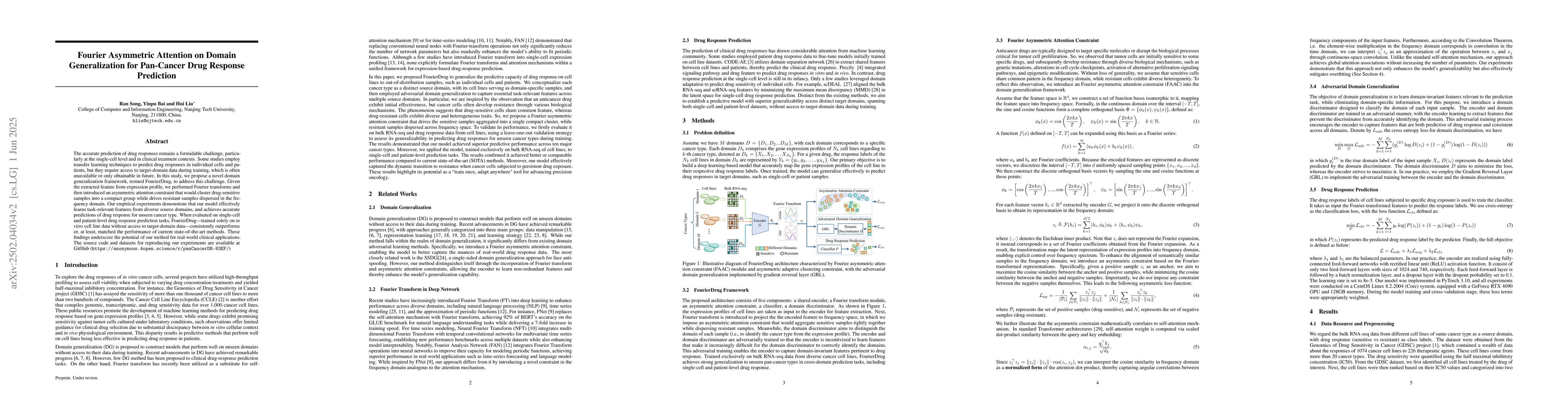 This work is novel due to its approach of employing Fourier asymmetric attention for domain generalization in pan-cancer drug response prediction, which doesn't necessitate target-domain data during training.