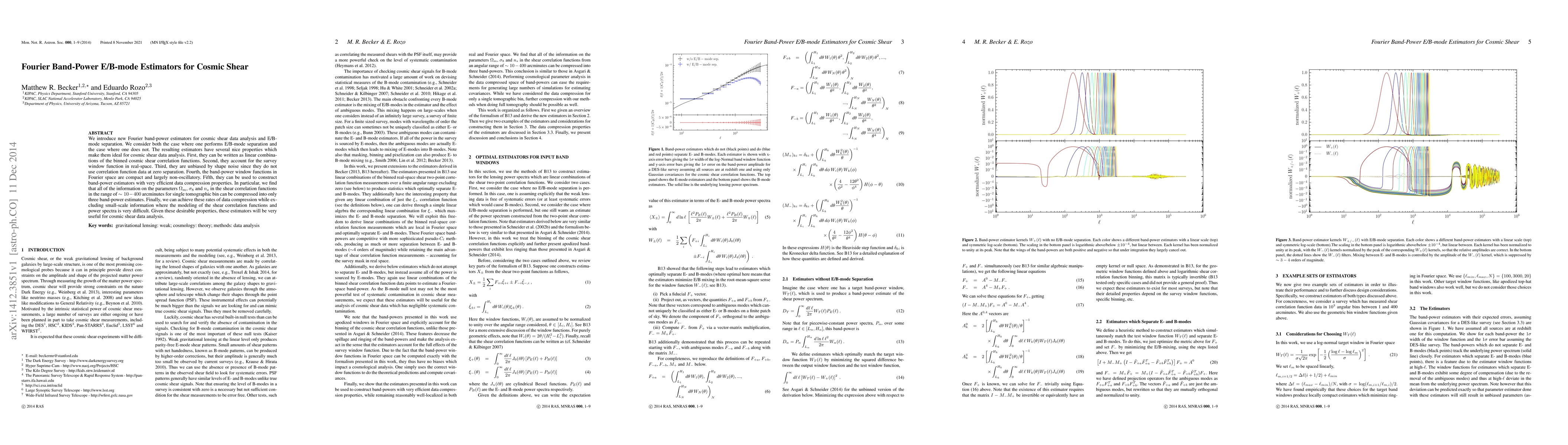 This paper introduces new Fourier band-power estimators for cosmic shear data analysis that effectively separate E/B modes and compress data efficiently. The estimators are linear combinations of binned cosmic shear correlation functions, accounting for survey window functions, and are unbiased by shape noise.