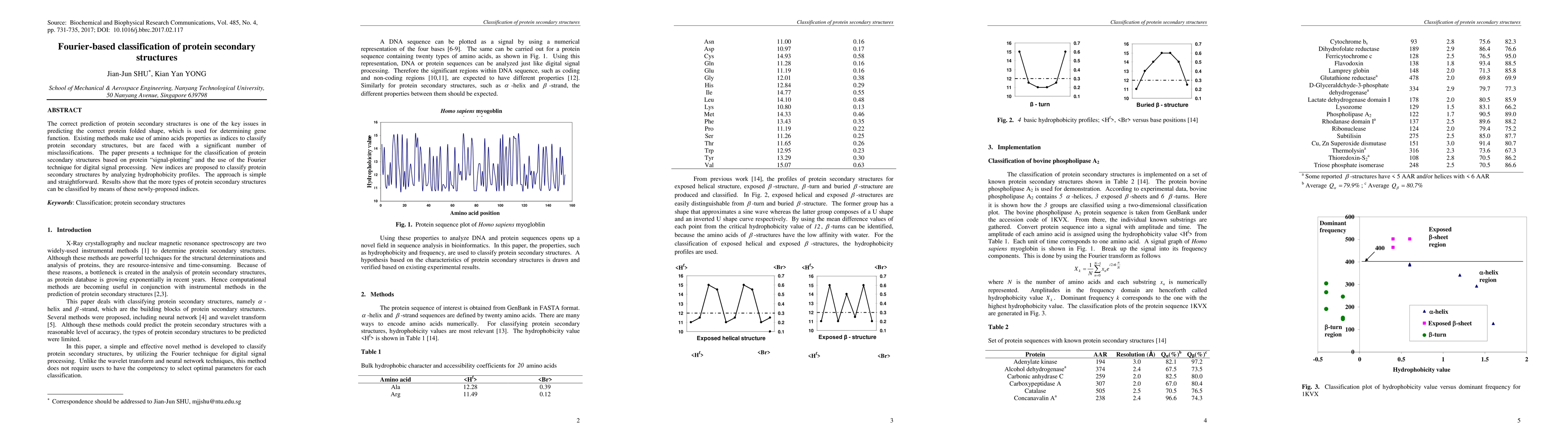 This paper introduces a Fourier-based method for classifying protein secondary structures using signal-plotting and digital signal processing, aiming to improve accuracy over existing amino acid property-based methods. The new indices derived from hydrophobicity profiles show enhanced classification performance for various protein secondary structures.