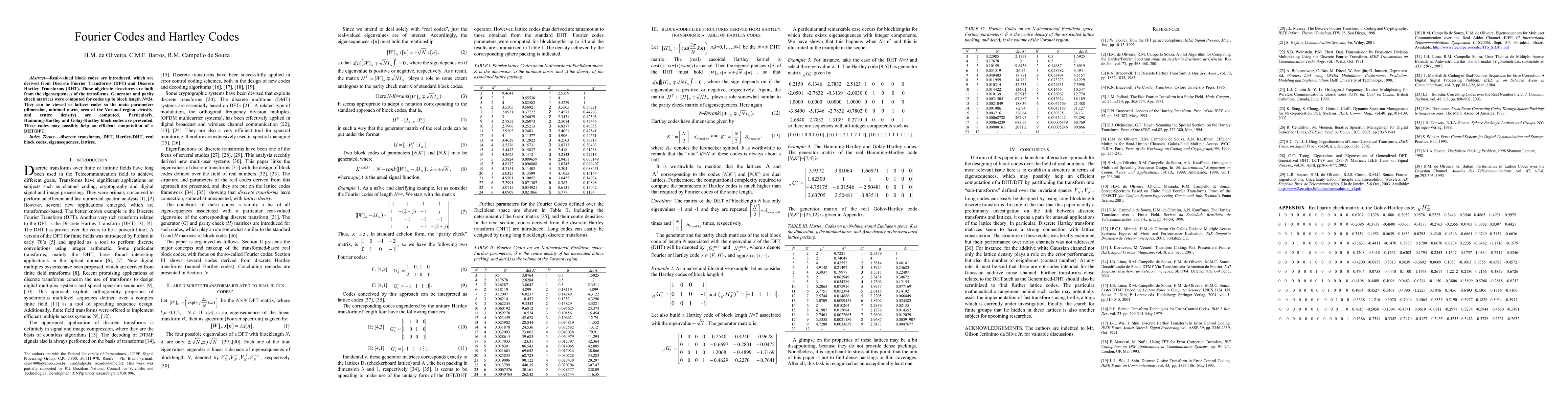 This paper introduces real-valued block codes derived from Discrete Fourier Transforms and Discrete Hartley Transforms, focusing on their algebraic structures and properties as lattice codes. It computes generator and parity check matrices for codes up to length N=24, highlighting parameters like minimal norm and density, and presents specific examples such as Hamming-Hartley and Golay-Hartley codes.
