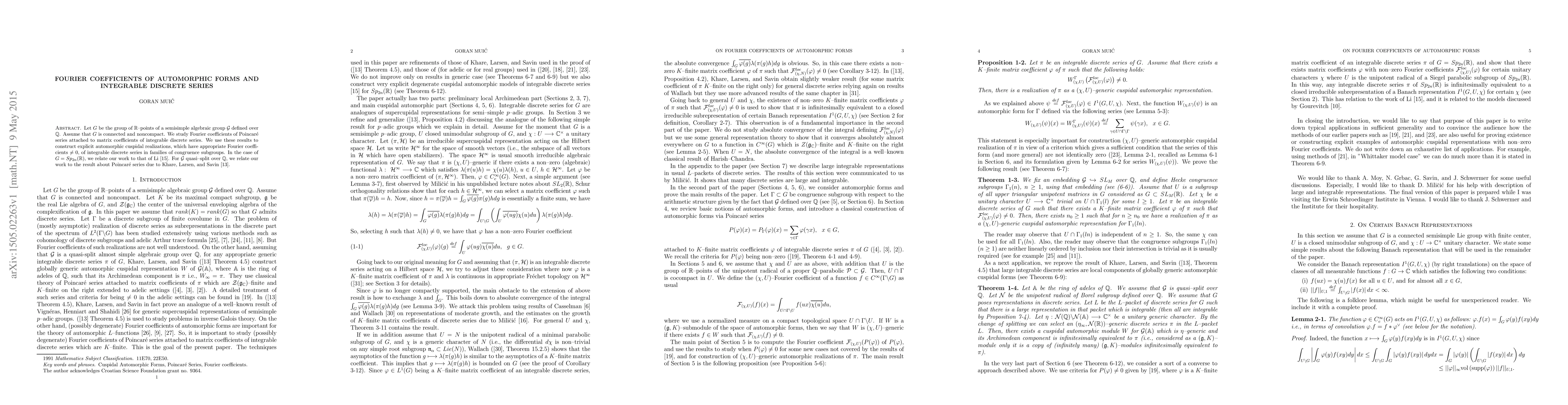 This paper investigates the Fourier coefficients of Poincaré series linked to matrix coefficients of integrable discrete series for the group $G = \mathbb{R}$-points of a semisimple algebraic group $\mathcal{G}$. It constructs explicit automorphic cuspidal realizations with non-zero Fourier coefficients for congruence subgroups.