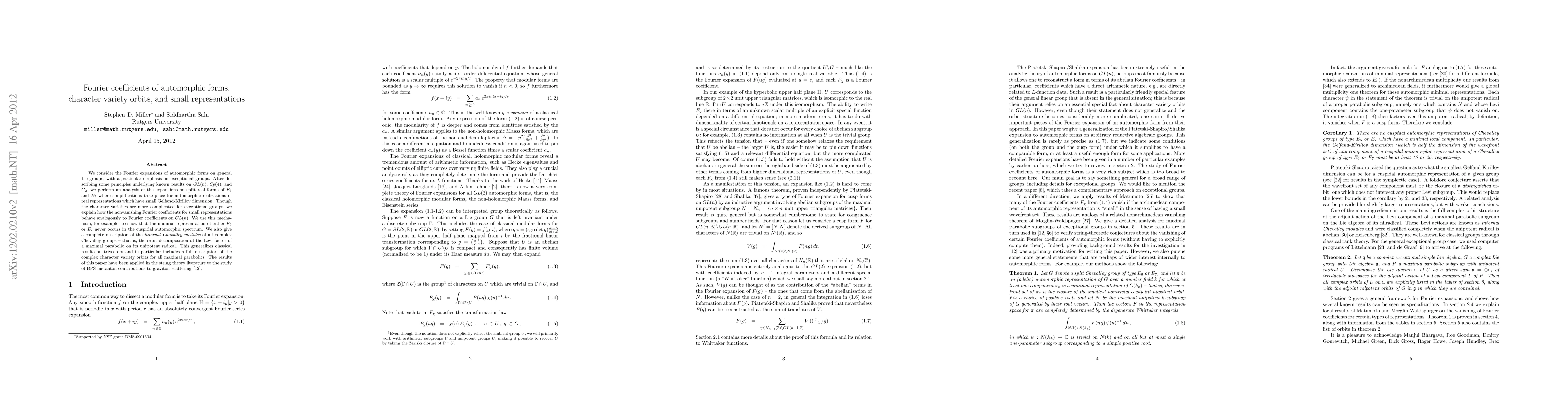 This paper investigates Fourier expansions of automorphic forms on exceptional Lie groups, specifically focusing on E_6 and E_7. It demonstrates analogous behavior of nonvanishing Fourier coefficients for small representations, leading to a proof that minimal representations of E_6 or E_7 do not appear in the cuspidal automorphic spectrum, and provides a comprehensive description of character variety orbits.
