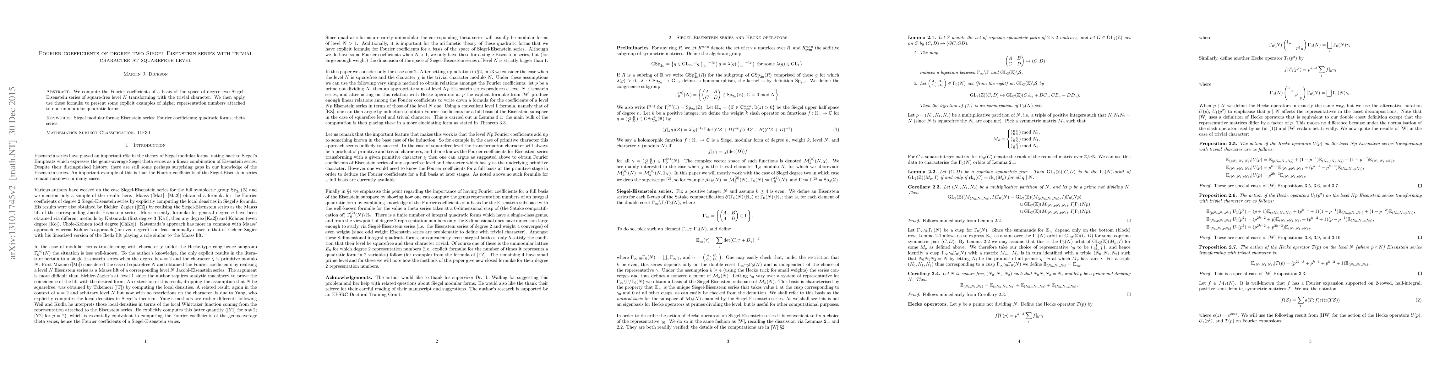 This paper calculates the Fourier coefficients for degree 2 Siegel-Eisenstein series at squarefree levels, utilizing the trivial character, and applies these results to provide explicit examples of higher representation numbers related to non-unimodular quadratic forms.