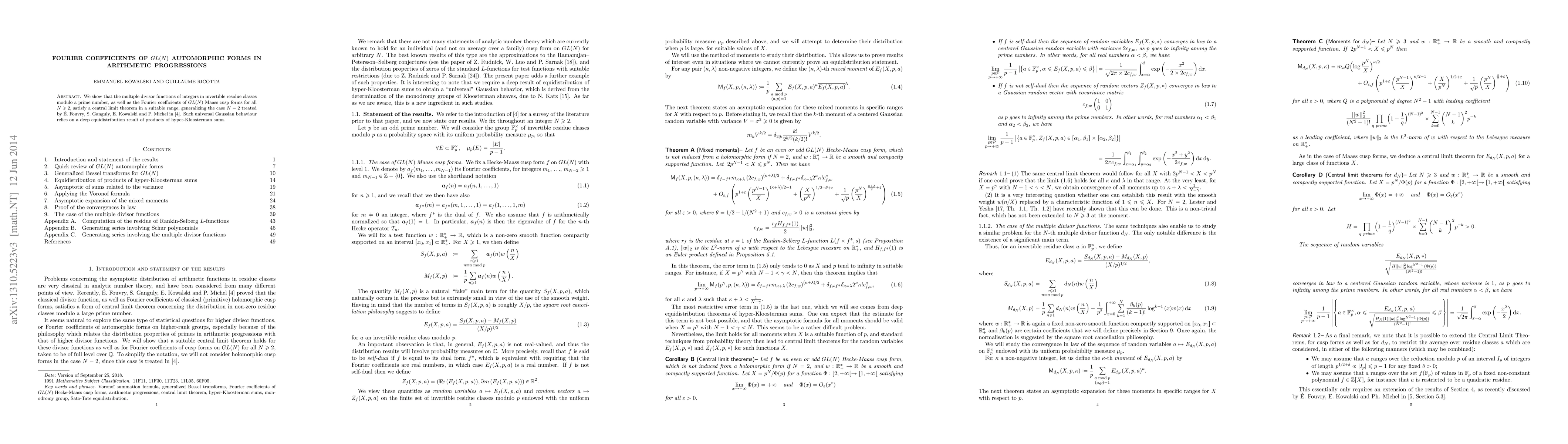 This paper demonstrates that Fourier coefficients of GL(N) Maass cusp forms (for N > 2) and multiple divisor functions in invertible residue classes modulo primes exhibit central limit behavior, generalizing previous results for N=2, and relies on the equidistribution of products of hyper-Kloosterman sums.