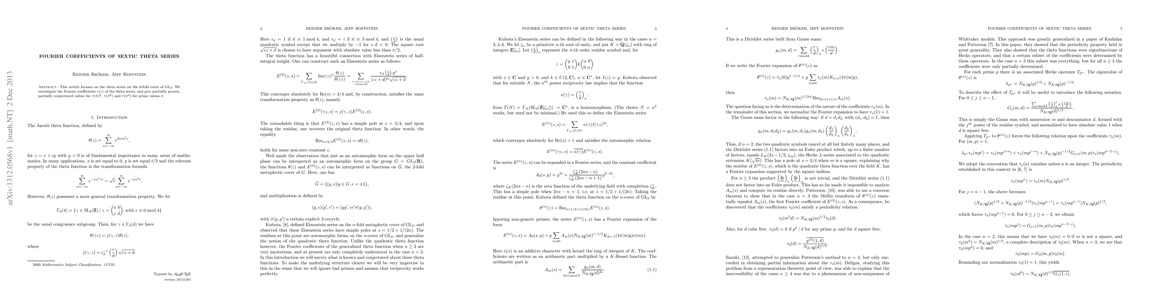 This paper examines the Fourier coefficients of a sextic theta series associated with a 6-fold cover of GL$_2$. It presents partially proven and conjectured values for the coefficients $\tau(\pi)^2$, $\tau(\pi^2)$, and $\tau(\pi^4)$ for prime $\pi$.