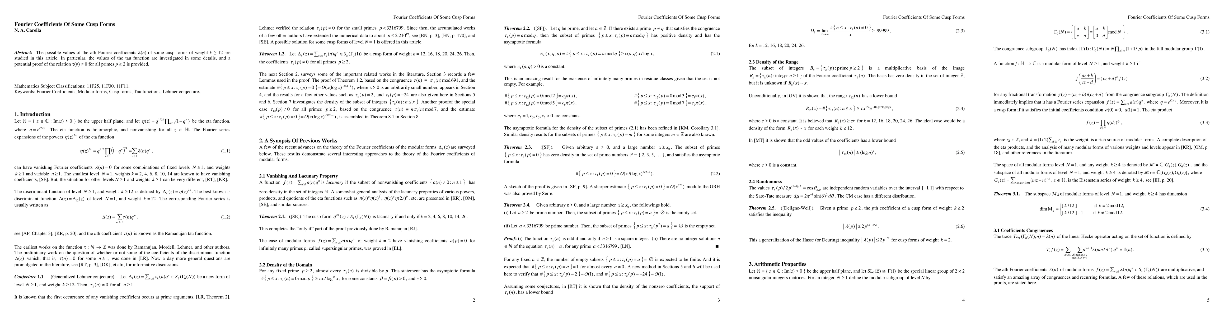 This paper investigates the nth Fourier coefficients of certain cusp forms of weight k ≥ 12, focusing on the values of the tau function. It proves that tau(p) ≠ 0 for all primes p ≥ p_0.