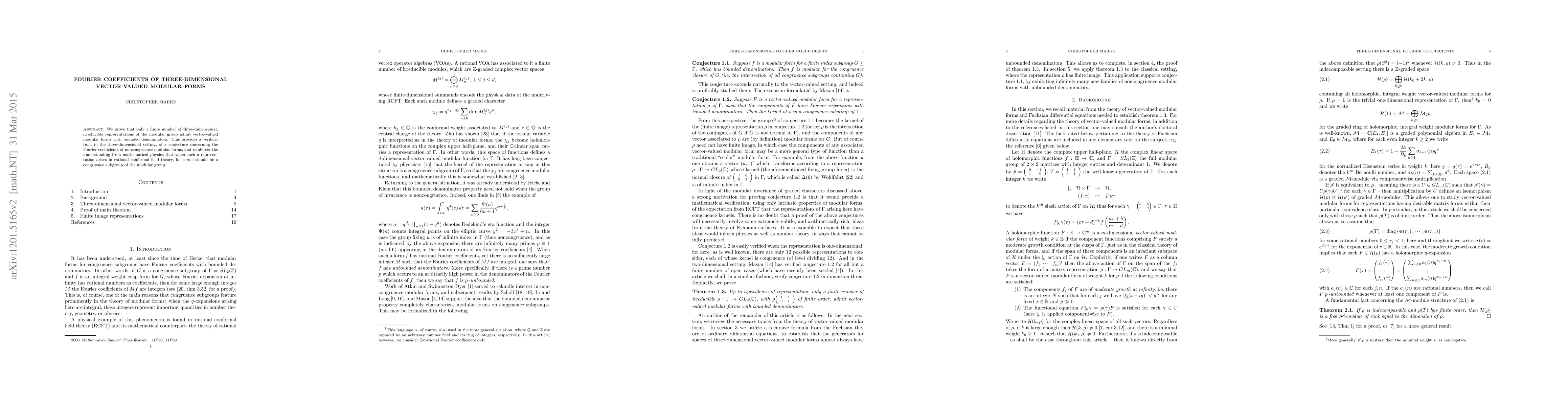 This paper analyzes the Fourier coefficients of three-dimensional vector-valued modular forms linked to irreducible representations of the modular group, showing that, except for a finite number of classes, rational coefficients exhibit "unbounded denominators." This verifies a conjecture extension regarding noncongruence modular forms in the three-dimensional context.