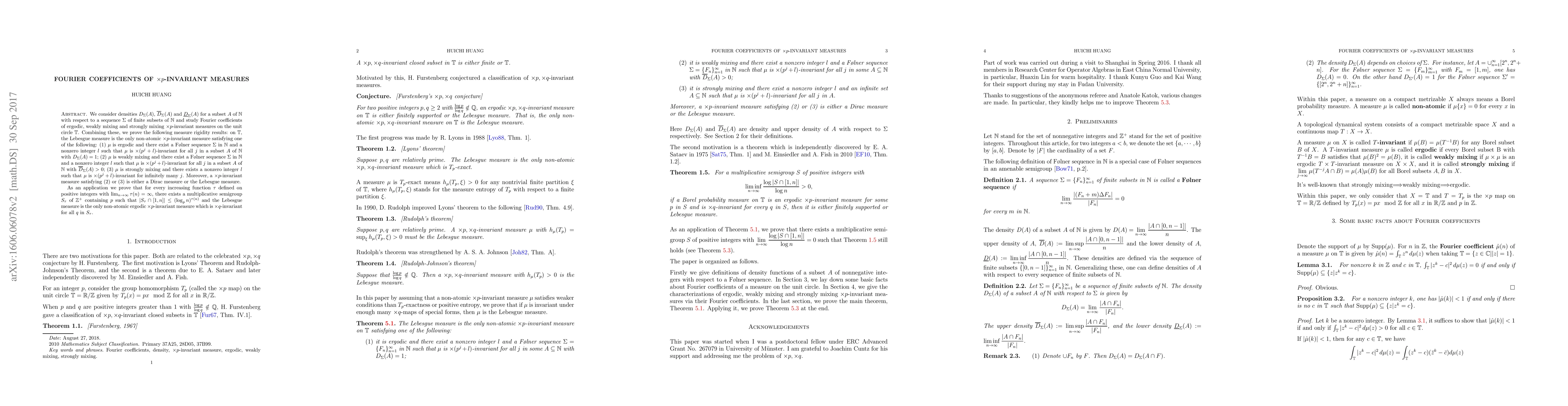 We consider densities $D_\Sigma(A)$, $\overline{D}_\Sigma(A)$ and $\underline{D}_\Sigma(A)$ for a subset $A$ of $\mathbb{N}$ with respect to a sequence $\Sigma$ of finite subsets of $\mathbb{N}$ and study Fourier coefficients of ergodic, weakly mixing and strongly mixing $\times p$-invariant measures on the unit circle $\mathbb{T}$. Combining these, we prove the following measure rigidity results: on $\mathbb{T}$, the Lebesgue measure is the only non-atomic $\times p$-invariant measure satisfying one of the following: (1) $\mu$ is ergodic and there exist a F\o lner sequence $\Sigma$ in $\mathbb{N}$ and a nonzero integer $l$ such that $\mu$ is $\times (p^j+l)$-invariant for all $j$ in a subset $A$ of $\mathbb{N}$ with $D_\Sigma(A)=1$; (2) $\mu$ is weakly mixing and there exist a F\o lner sequence $\Sigma$ in $\mathbb{N}$ and a nonzero integer $l$ such that $\mu$ is $\times (p^j+l)$-invariant for all $j$ in a subset $A$ of $\mathbb{N}$ with $\overline{D}_\Sigma(A)>0$; (3) $\mu$ is strongly mixing and there exists a nonzero integer $l$ such that $\mu$ is $\times (p^j+l)$-invariant for infinitely many $j$. Moreover, a $\times p$-invariant measure satisfying (2) or (3) is either a Dirac measure or the Lebesgue measure. As an application we prove that for every increasing function $\tau$ defined on positive integers with $\lim_{n\to\infty}\tau(n)=\infty$, there exists a multiplicative semigroup $S_\tau$ of $\mathbb{Z}^+$ containing $p$ such that $|S_\tau\cap[1,n]|\leq (\log_p n)^{\tau(n)}$ and the Lebesgue measure is the only non-atomic ergodic $\times p$-invariant measure which is $\times q$-invariant for all $q$ in $S_\tau$.