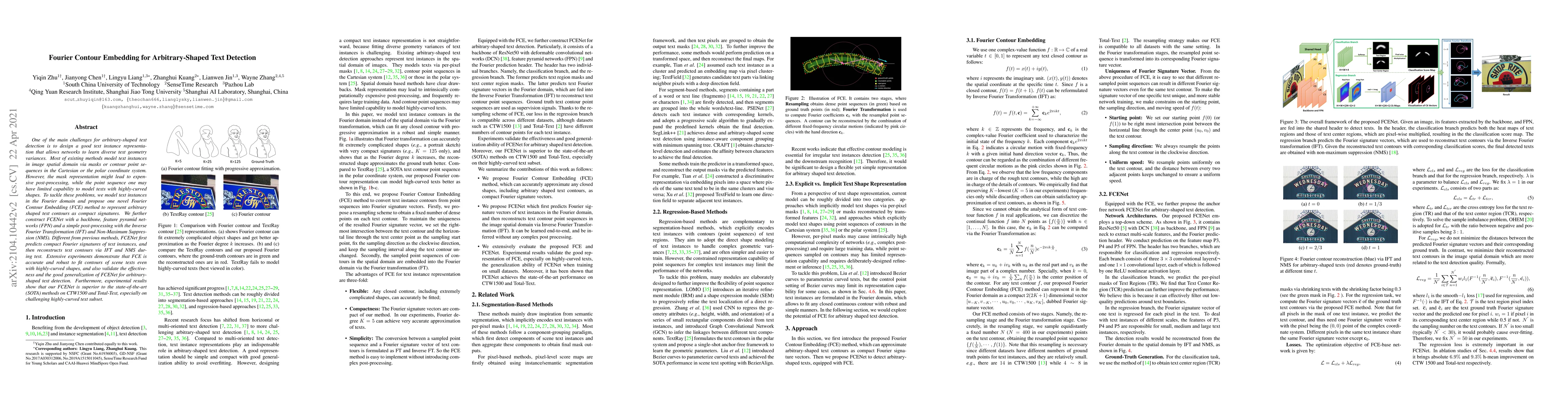 This paper proposes a Fourier Contour Embedding (FCE) method to represent arbitrary-shaped text contours as compact Fourier signatures, enabling accurate and robust detection. FCENet, which predicts these signatures and reconstructs contours via Inverse Fourier Transformation, outperforms state-of-the-art methods on datasets with highly-curved text.