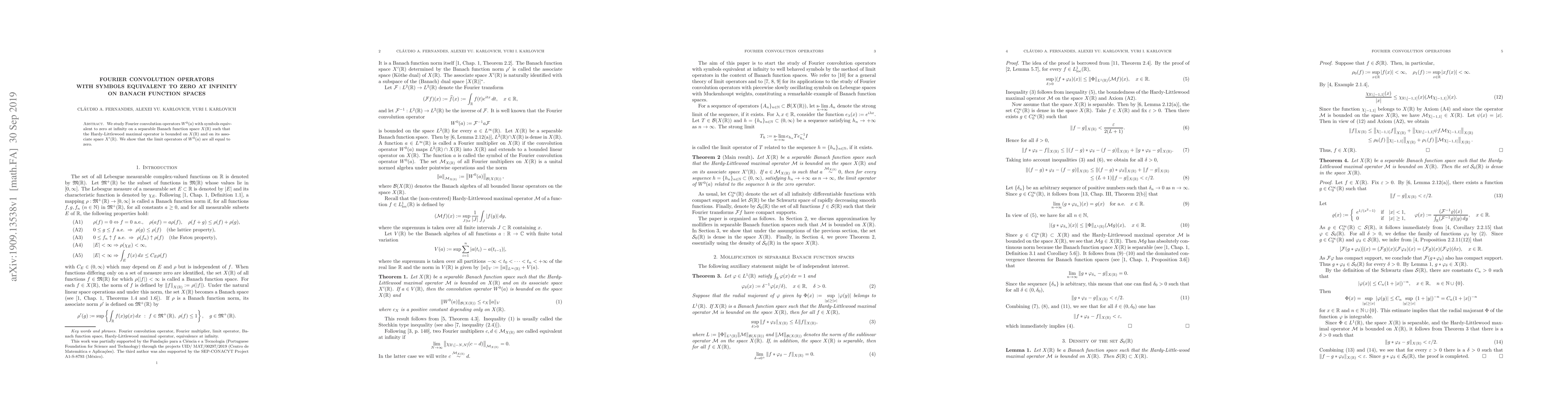 We study Fourier convolution operators $W^0(a)$ with symbols equivalent to zero at infinity on a separable Banach function space $X(\mathbb{R})$ such that the Hardy-Littlewood maximal operator is bounded on $X(\mathbb{R})$ and on its associate space $X'(\mathbb{R})$. We show that the limit operators of $W^0(a)$ are all equal to zero.