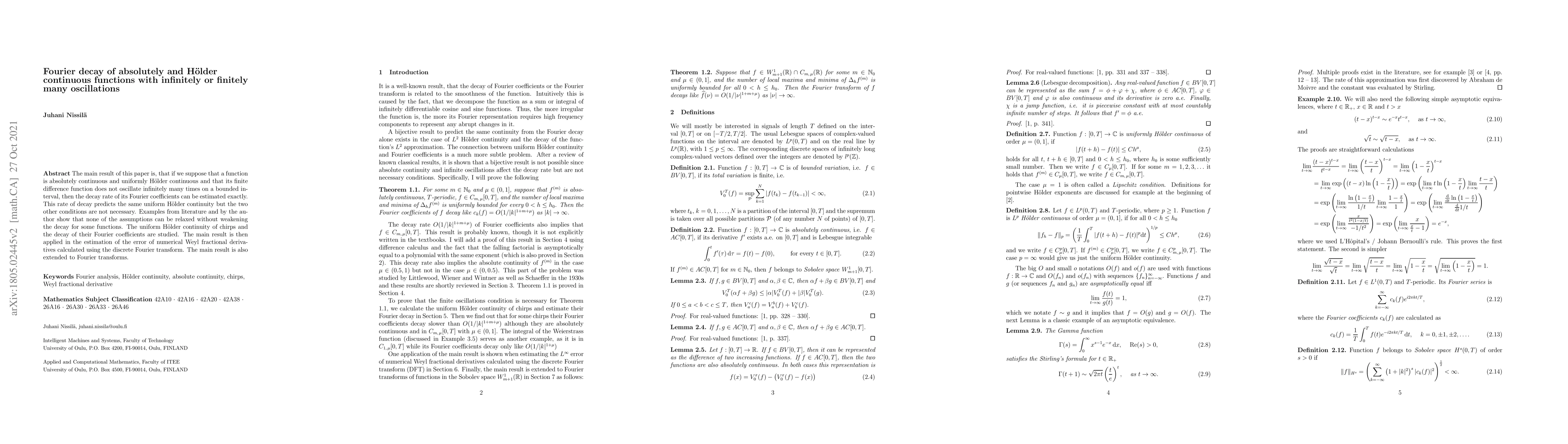 The main result of this paper is, that if we suppose that a function is absolutely continuous and uniformly H\"older continuous and that it's finite difference function does not oscillate infinitely often on a bounded interval, then the decay rate of its Fourier coefficients can be estimated exactly. This rate of decay predicts the same uniform H\"older continuity but the two other conditions are not necessary. Several examples from literature and by the author show that none of the assumptions can be relaxed without weakening the decay for some functions. The uniform H\"older continuity of chirps and the decay of their Fourier coefficients are studied. The main result is then applied in the estimation of the error of numerical Weyl fractional derivatives calculated using the discrete Fourier transform. The main result is also extended to Fourier transforms.