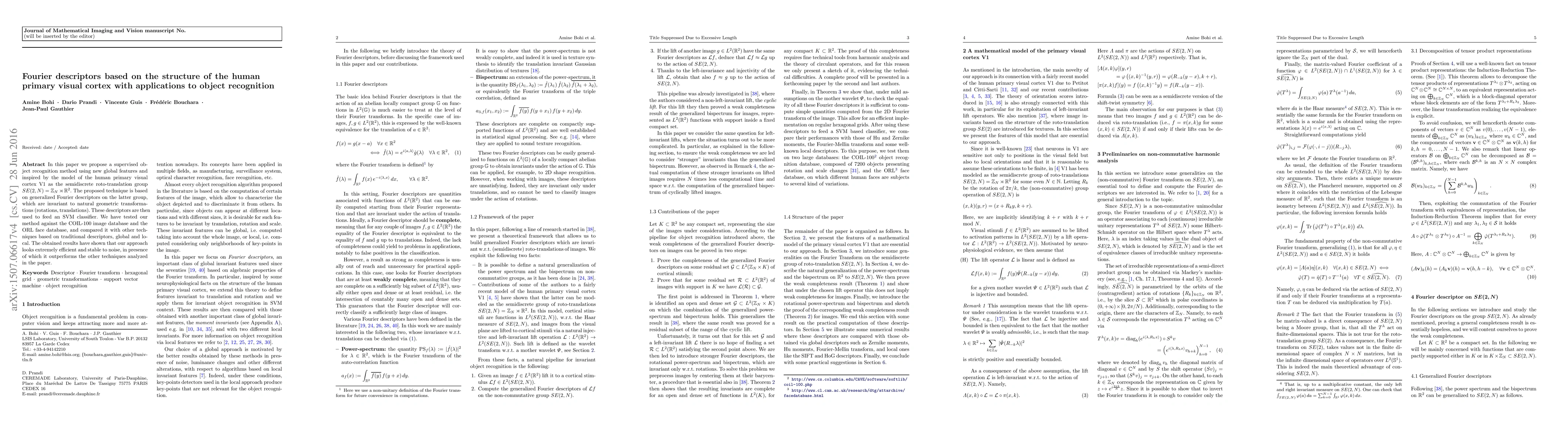 In this paper we propose a supervised object recognition method using new global features and inspired by the model of the human primary visual cortex V1 as the semidiscrete roto-translation group $SE(2,N) = \mathbb Z_N\rtimes \mathbb R^2$. The proposed technique is based on generalized Fourier descriptors on the latter group, which are invariant to natural geometric transformations (rotations, translations). These descriptors are then used to feed an SVM classifier. We have tested our method against the COIL-100 image database and the ORL face database, and compared it with other techniques based on traditional descriptors, global and local. The obtained results have shown that our approach looks extremely efficient and stable to noise, in presence of which it outperforms the other techniques analyzed in the paper.