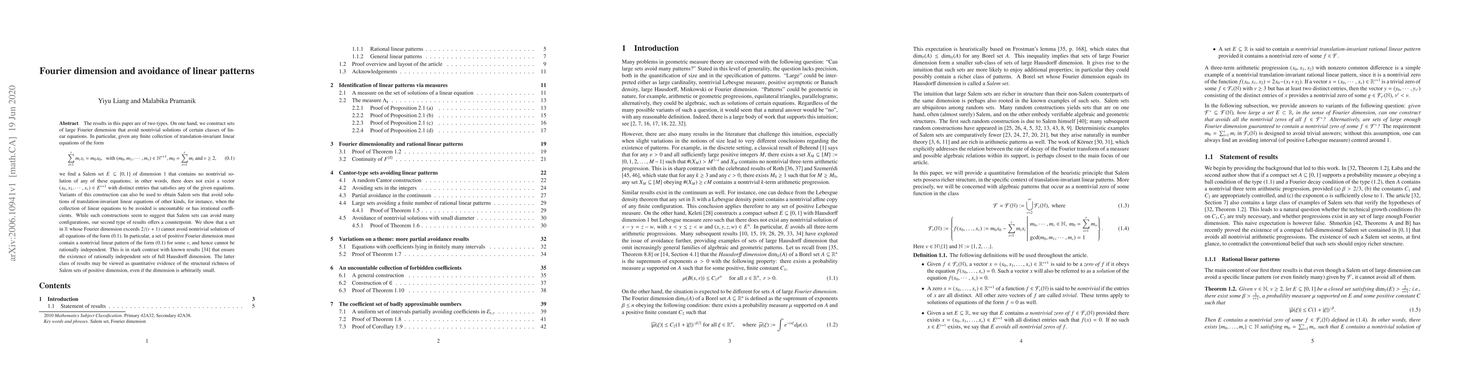 The work combines Fourier dimension theory with set avoidance problems, offering new perspectives on the interplay between these areas and presenting constructions that avoid linear patterns in sets of high Fourier dimension.