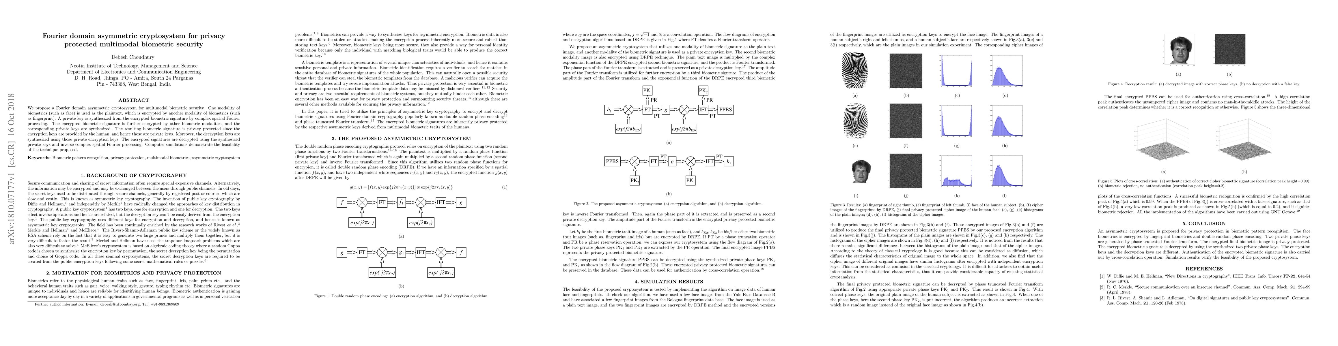 This paper proposes a Fourier domain asymmetric cryptosystem for multimodal biometric security, where one biometric modality encrypts another, ensuring privacy protected multimodal biometric security through complex spatial Fourier processing and synthesized private keys. Simulation results demonstrate the technique's feasibility.