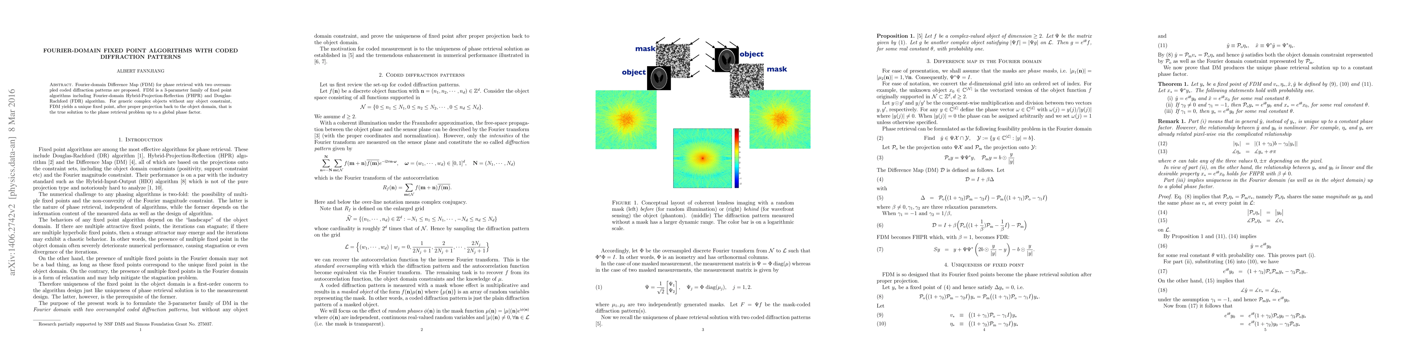 This paper proposes Fourier-domain Difference Map (FDM) algorithms for phase retrieval using oversampled coded diffraction patterns, including FHPR and FDR methods. These algorithms yield a unique fixed point solution, representing the true object up to a global phase factor, for generic complex objects.