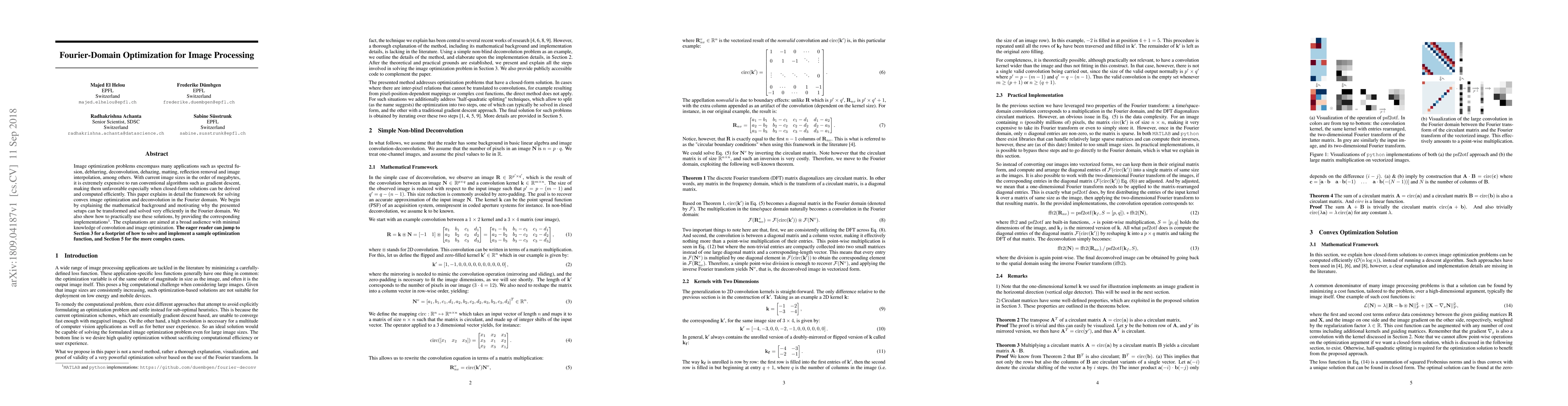 Image optimization problems encompass many applications such as spectral fusion, deblurring, deconvolution, dehazing, matting, reflection removal and image interpolation, among others. With current image sizes in the order of megabytes, it is extremely expensive to run conventional algorithms such as gradient descent, making them unfavorable especially when closed-form solutions can be derived and computed efficiently. This paper explains in detail the framework for solving convex image optimization and deconvolution in the Fourier domain. We begin by explaining the mathematical background and motivating why the presented setups can be transformed and solved very efficiently in the Fourier domain. We also show how to practically use these solutions, by providing the corresponding implementations. The explanations are aimed at a broad audience with minimal knowledge of convolution and image optimization. The eager reader can jump to Section 3 for a footprint of how to solve and implement a sample optimization function, and Section 5 for the more complex cases.