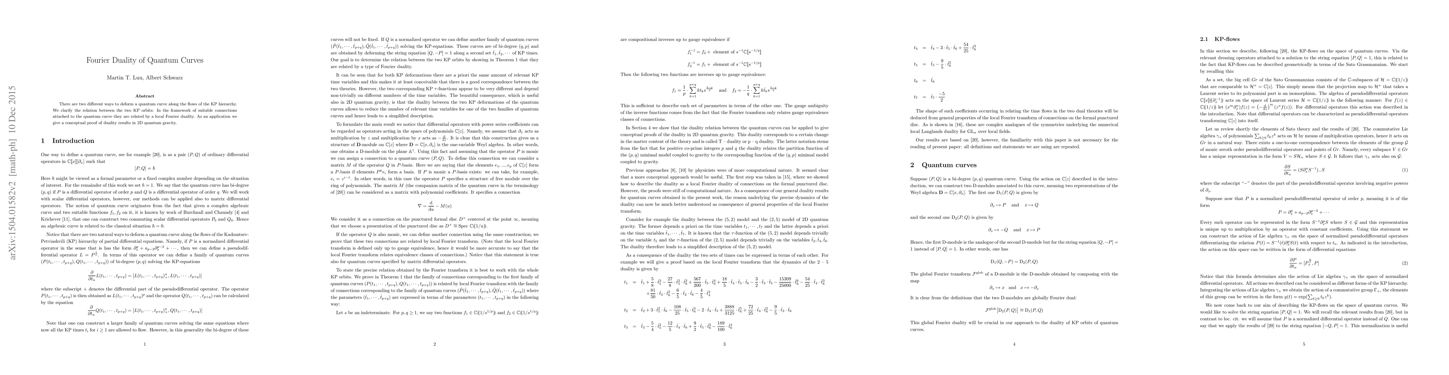 There are two different ways to deform a quantum curve along the flows of the KP hierarchy. We clarify the relation between the two KP orbits: In the framework of suitable connections attached to the quantum curve they are related by a local Fourier duality. As an application we give a conceptual proof of duality results in 2D quantum gravity.