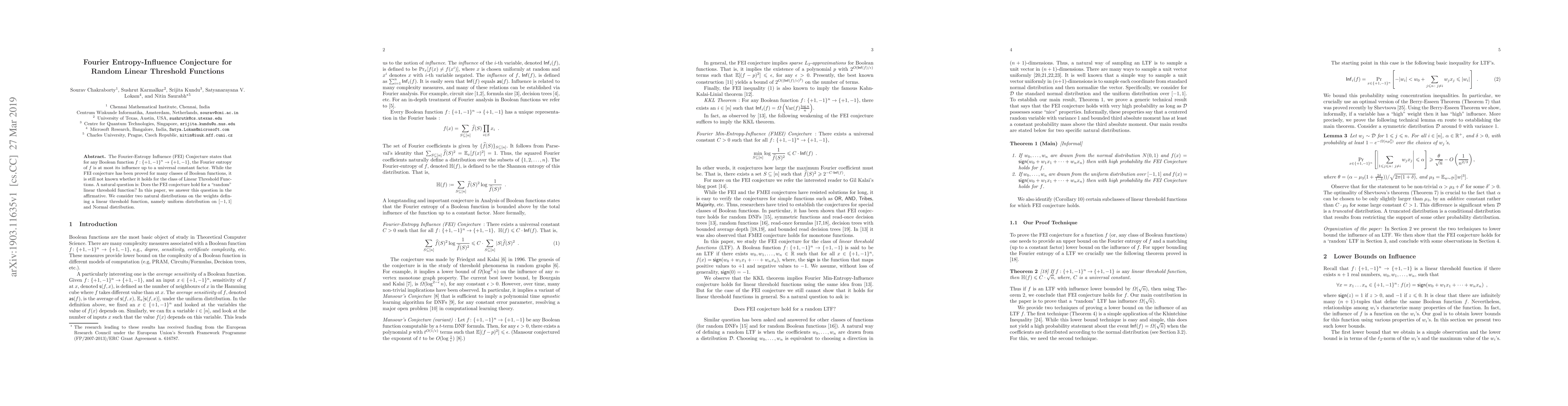 This paper confirms the Fourier-Entropy Influence Conjecture for random linear threshold functions, showing that the Fourier entropy of such functions is bounded by their influence under both uniform and normal distributions of the weights. This extends the conjecture's validity to a broader class of Boolean functions.
