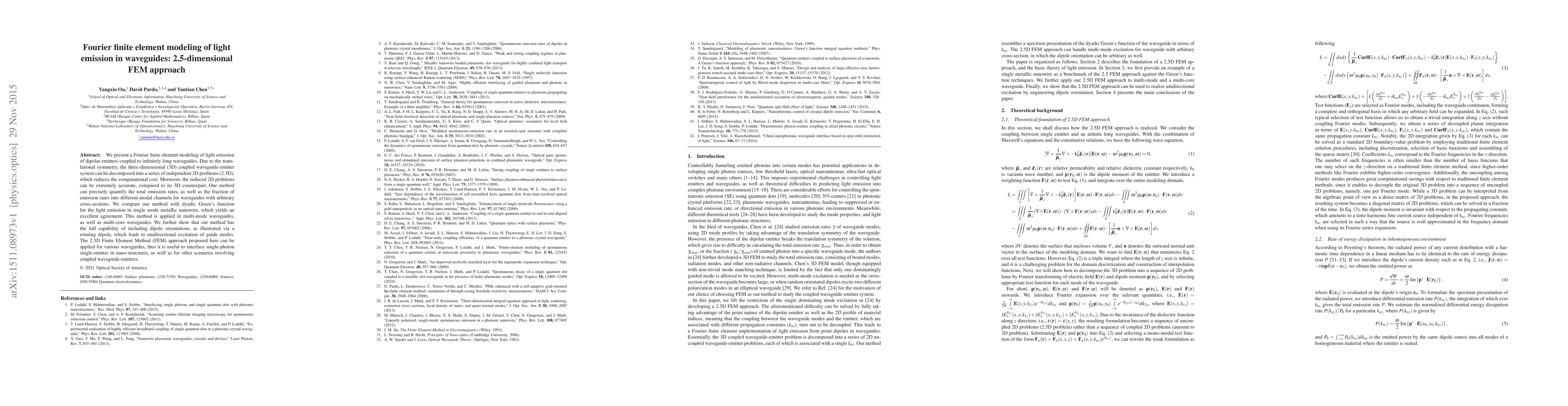This paper introduces a Fourier finite element modeling approach for light emission in waveguides, utilizing a 2.5-dimensional FEM method to decompose 3D problems into 2D, significantly reducing computational costs while maintaining high accuracy. The method precisely quantifies emission rates and their distribution into different waveguide modes.