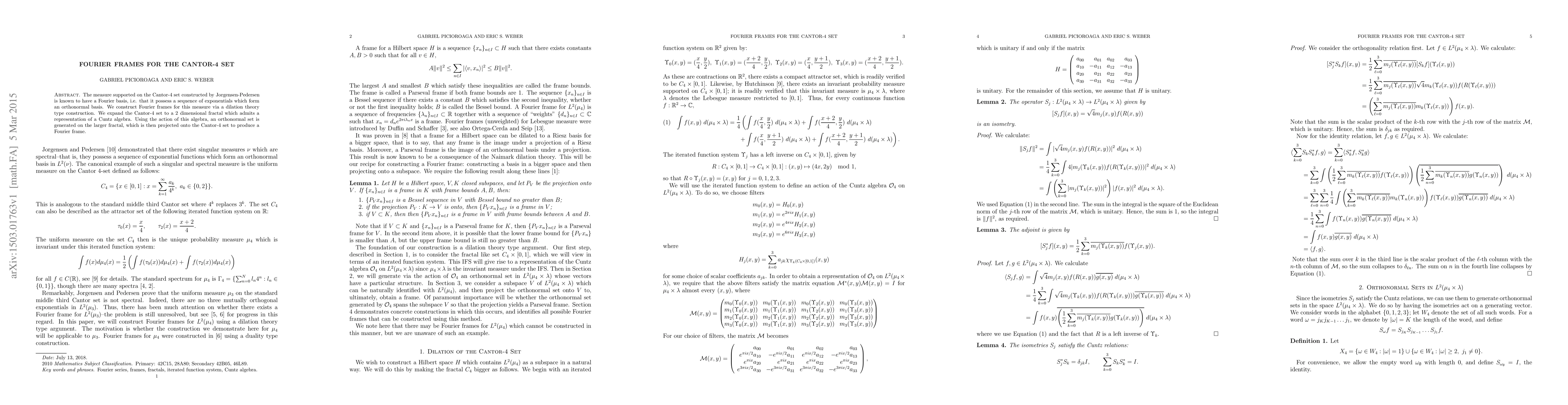 This paper constructs Fourier frames for the measure on the Cantor-4 set using a dilation theory approach. It expands the Cantor-4 set into a 2D fractal and generates an orthonormal set via the action of a Cuntz algebra, which is then projected back to form the Fourier frame.