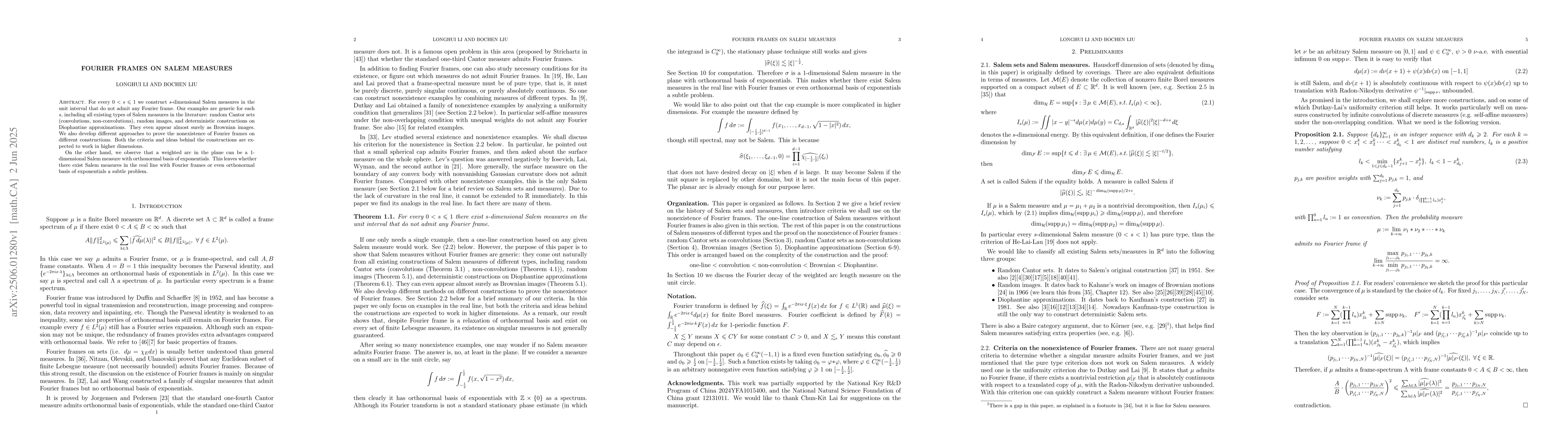 Researchers create $s$-dimensional Salem measures that do not have Fourier frames, using various constructions including random Cantor sets and Brownian images, and raise the question of whether real-line Salem measures with Fourier frames exist.