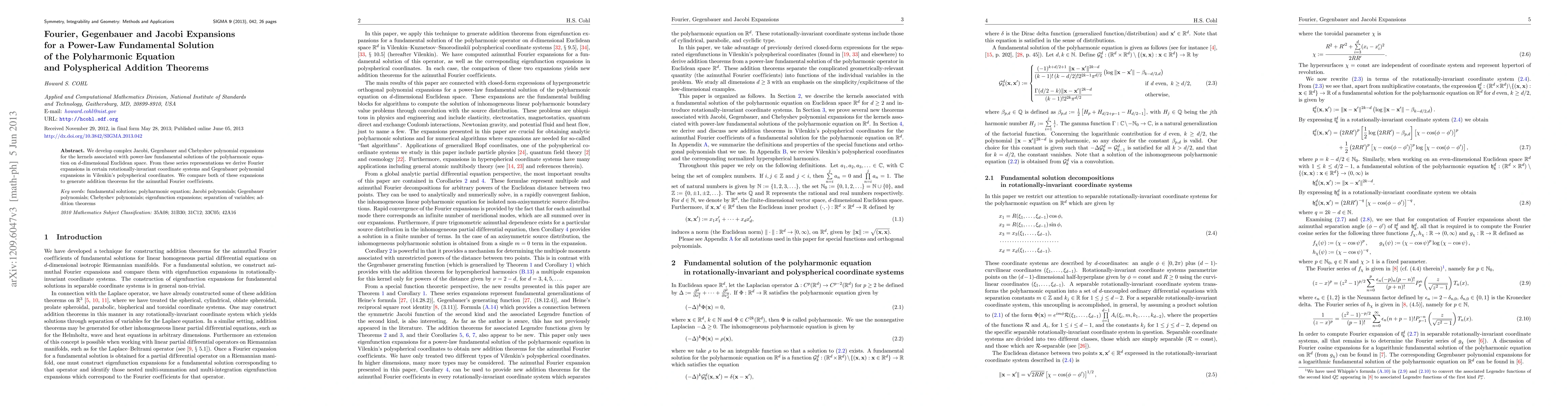 This paper develops complex Jacobi, Gegenbauer, and Chebyshev polynomial expansions for power-law fundamental solutions of the polyharmonic equation in d-dimensional space, deriving Fourier and Gegenbauer expansions in specific coordinate systems to generate addition theorems for azimuthal Fourier coefficients.