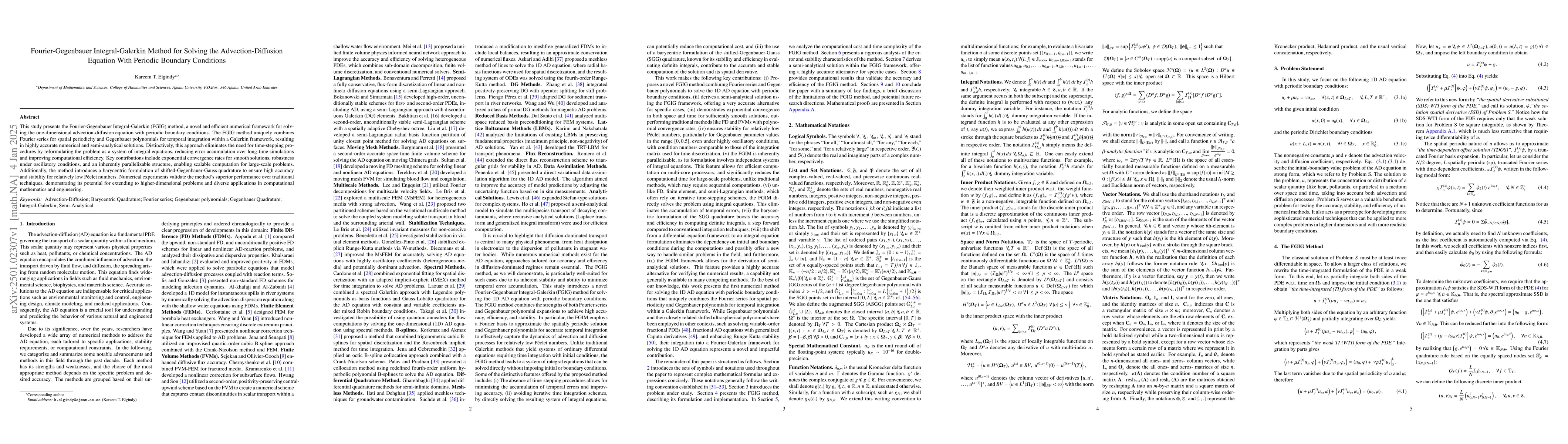 The Fourier-Gegenbauer Integral-Galerkin (FGIG) method is presented for solving the one-dimensional advection-diffusion equation with periodic boundary conditions, combining Fourier series and Gegenbauer polynomials in a Galerkin framework for accurate and efficient numerical solutions. The method reformulates the problem into integral equations, enhancing stability and scalability for large-scale simulations.
