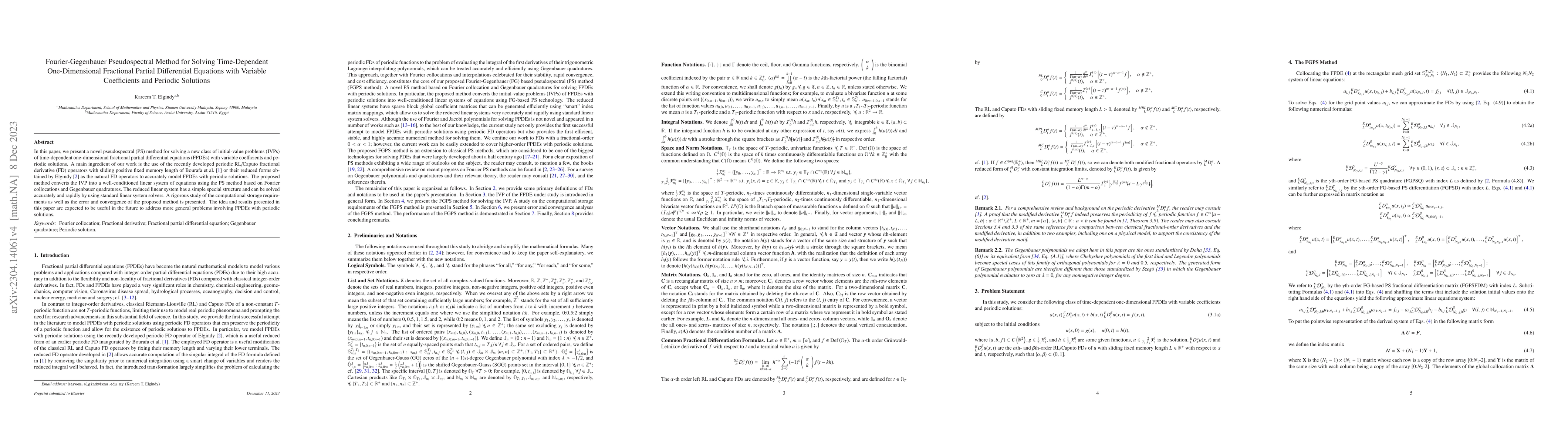 This paper introduces a novel Fourier-Gegenbauer pseudospectral method for solving time-dependent one-dimensional fractional partial differential equations with variable coefficients and periodic solutions. It employs advanced fractional derivative operators and converts the problem into a well-conditioned linear system, which can be efficiently solved using standard solvers.