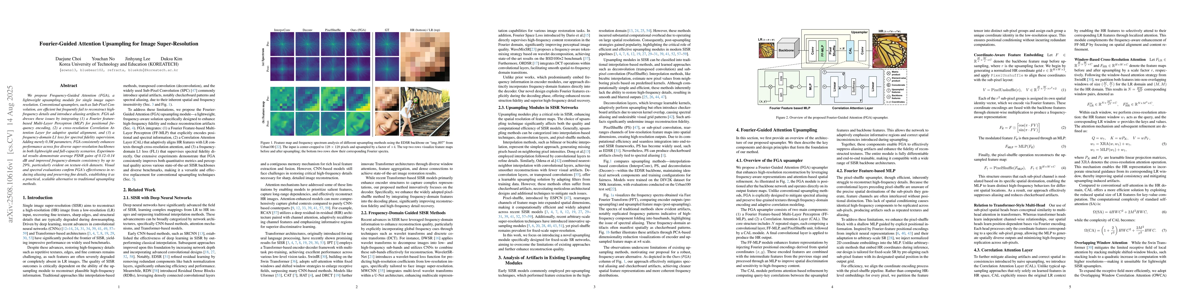 We propose Frequency-Guided Attention (FGA), a lightweight upsampling module for single image super-resolution. Conventional upsamplers, such as Sub-Pixel Convolution, are efficient but frequently fail to reconstruct high-frequency details and introduce aliasing artifacts. FGA addresses these issues by integrating (1) a Fourier feature-based Multi-Layer Perceptron (MLP) for positional frequency encoding, (2) a cross-resolution Correlation Attention Layer for adaptive spatial alignment, and (3) a frequency-domain L1 loss for spectral fidelity supervision. Adding merely 0.3M parameters, FGA consistently enhances performance across five diverse super-resolution backbones in both lightweight and full-capacity scenarios. Experimental results demonstrate average PSNR gains of 0.12~0.14 dB and improved frequency-domain consistency by up to 29%, particularly evident on texture-rich datasets. Visual and spectral evaluations confirm FGA's effectiveness in reducing aliasing and preserving fine details, establishing it as a practical, scalable alternative to traditional upsampling methods.