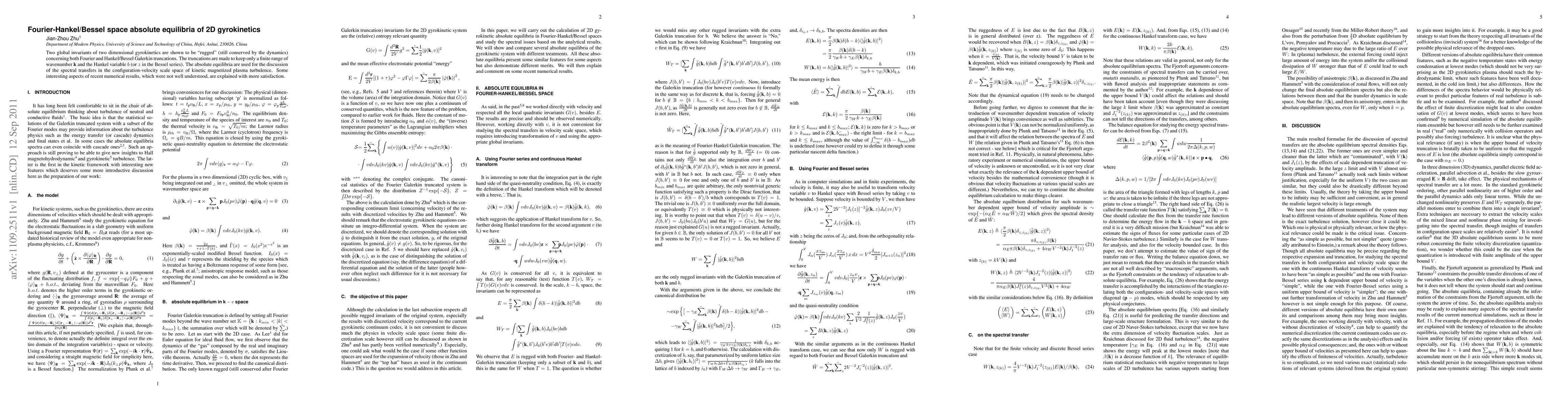 Two global invariants of two dimensional gyrokinetics are shown to be "rugged" (still conserved by the dynamics) concerning both Fourier and Hankel/Bessel Galerkin truncations. The truncations are made to keep only a finite range of wavenumber $\textbf{k}$ and the Hankel variable $b$ (or $z$ in the Bessel series). The absolute equilibria are used for the discussion of the spectral transfers in the configuration-velocity scale space of kinetic magnetized plasma turbulence. Some interesting aspects of recent numerical results, which were not well understood, are explained with more satisfaction.