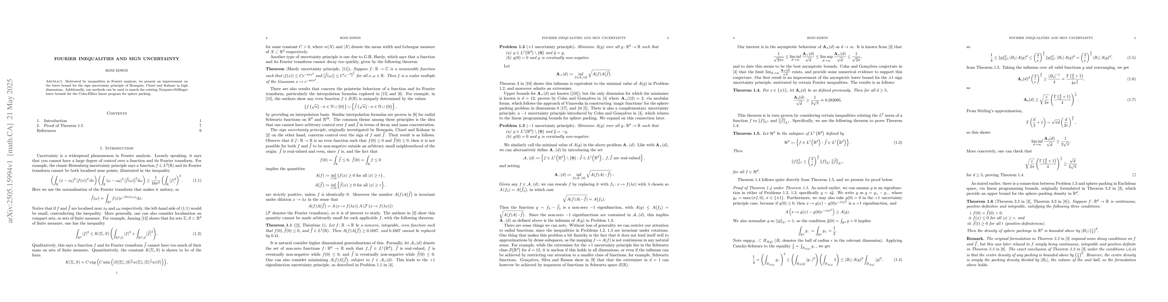 Development of new techniques for Fourier inequalities and their application to sign uncertainty and sphere packing problems.