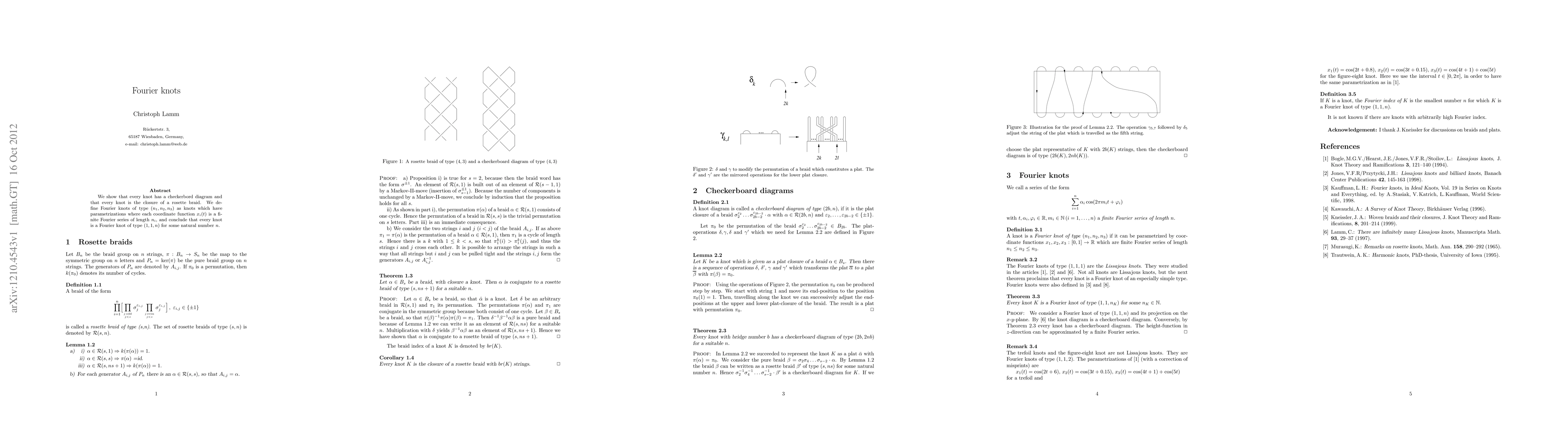 This paper demonstrates that every knot can be represented by a checkerboard diagram and is the closure of a rosette braid. It introduces Fourier knots, defined as knots with coordinate functions that are finite Fourier series, concluding that every knot is a Fourier knot of type (1, 1, n) for some natural number n.