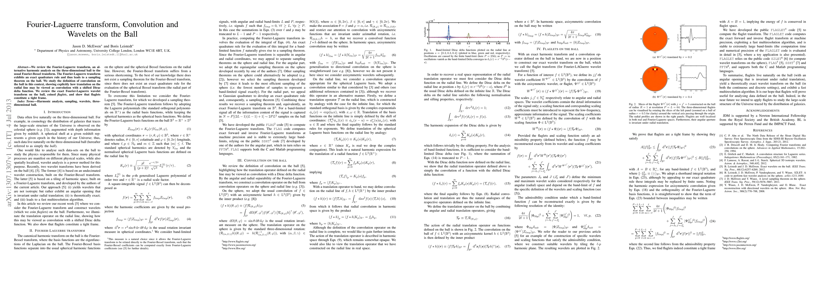 The paper introduces an alternative harmonic analysis on the three-dimensional ball using the Fourier-Laguerre transform, develops a convolution operator on the ball, and constructs an exact wavelet transform (flaglets) on the ball, which forms a tight frame.