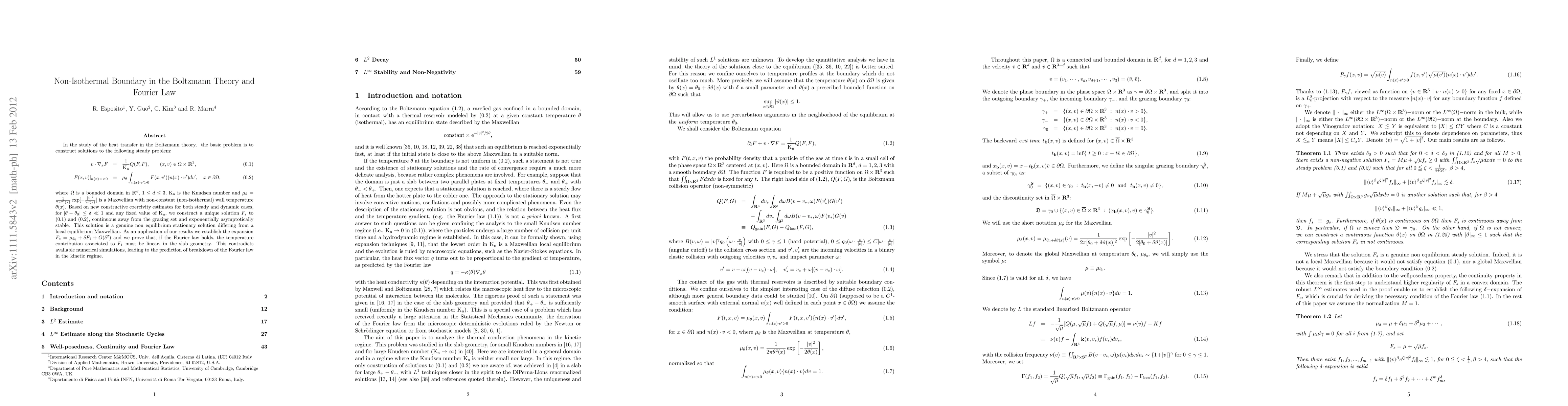 In the study of the heat transfer in the Boltzmann theory, the basic problem is to construct solutions to the steady problem for the Boltzmann equation in a general bounded domain with diffuse reflection boundary conditions corresponding to a non isothermal temperature of the wall. Denoted by \delta the size of the temperature oscillations on the boundary, we develop a theory to characterize such a solution mathematically. We construct a unique solution F_s to the Boltzmann equation, which is dynamically asymptotically stable with exponential decay rate. Moreover, if the domain is convex and the temperature of the wall is continuous we show that F_s is continuous away from the grazing set. If the domain is non-convex, discontinuities can form and then propagate along the forward characteristics. We show that they actually form for a suitable smooth temperature profile. We remark that this solution differs from a local equilibrium Maxwellian, hence it is a genuine non equilibrium stationary solution. Our analysis is based on recent studies of the boundary value problems for the Boltzmann equation but with new constructive coercivity estimates for both steady and dynamic cases. A natural question in this setup is to determine if the general Fourier law, stating that the heat conduction vector q is proportional to the temperature gradient, is valid. As an application of our result we establish an expansion in \delta for F_s whose first order term F_1 satisfies a linear, parameter free equation. Consequently, we discover that if the Fourier law were valid for F_s, then the temperature of F_1 must be linear in a slab. Such a necessary condition contradicts available numerical simulations, leading to the prediction of break-down of the Fourier law in the kinetic regime.