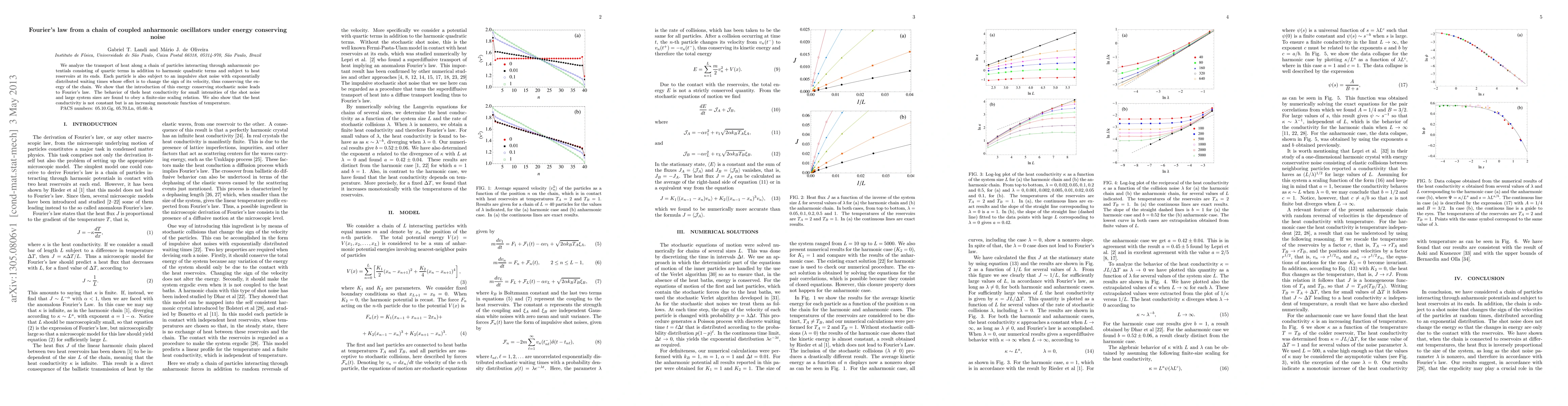 This paper explores heat transport in a chain of anharmonic oscillators subjected to energy-conserving impulsive noise, demonstrating that such noise leads to Fourier's law of heat conduction. The heat conductivity is shown to be a monotonic increasing function of temperature and obeys a finite-size scaling relation for small noise intensities and large system sizes.