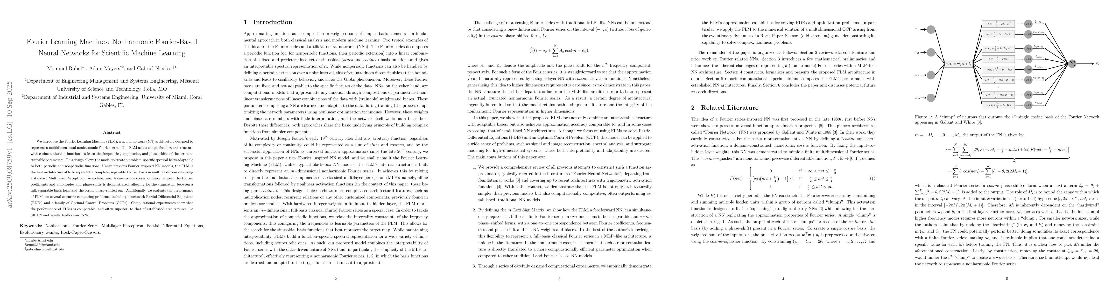 We introduce the Fourier Learning Machine (FLM), a neural network (NN) architecture designed to represent a multidimensional nonharmonic Fourier series. The FLM uses a simple feedforward structure with cosine activation functions to learn the frequencies, amplitudes, and phase shifts of the series as trainable parameters. This design allows the model to create a problem-specific spectral basis adaptable to both periodic and nonperiodic functions. Unlike previous Fourier-inspired NN models, the FLM is the first architecture able to represent a complete, separable Fourier basis in multiple dimensions using a standard Multilayer Perceptron-like architecture. A one-to-one correspondence between the Fourier coefficients and amplitudes and phase-shifts is demonstrated, allowing for the translation between a full, separable basis form and the cosine phase--shifted one. Additionally, we evaluate the performance of FLMs on several scientific computing problems, including benchmark Partial Differential Equations (PDEs) and a family of Optimal Control Problems (OCPs). Computational experiments show that the performance of FLMs is comparable, and often superior, to that of established architectures like SIREN and vanilla feedforward NNs.