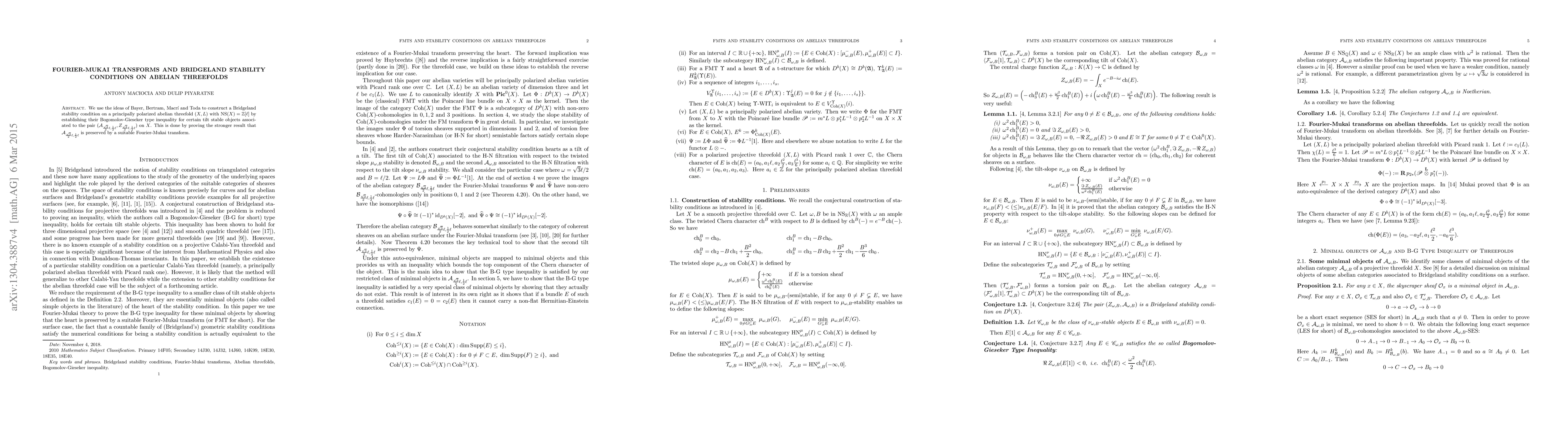 Summary: This paper establishes a Bridgeland stability condition on a principally polarized abelian threefold using the construction by Bayer, Bertram, Macri, and Toda, confirming a generalized Bogomolov-Gieseker inequality. It leverages a Fourier-Mukai transform to preserve the heart of a conjectural stability condition and identifies flat line bundles as the only reflexive sheaves with zero first and second Chern classes.