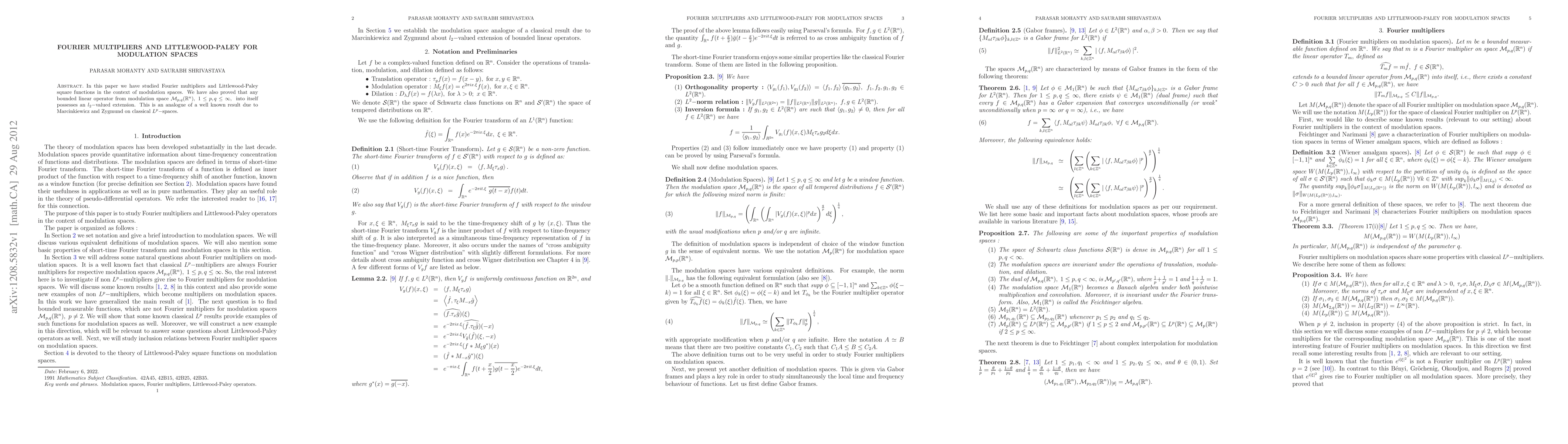 In this paper we have studied Fourier multipliers and Littlewood-Paley square functions in the context of modulation spaces. We have also proved that any bounded linear operator from modulation space $\mathcal{M}_{p,q}(\R^n), 1\leq p,q\leq \infty,$ into itself possesses an $l_2-$valued extension. This is an analogue of a well known result due to Marcinkiewicz and Zygmund on classical $L^p-$spaces.